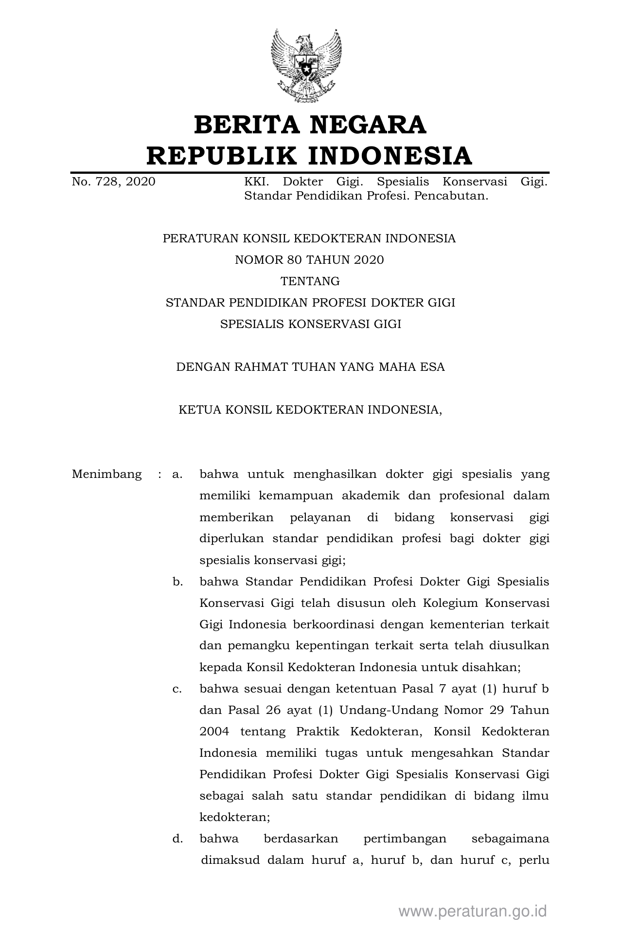 PERBAN Nomor 80 Tahun 2020 | Peraturan Badan Nomor 80 Tahun 2020 tentang STANDAR PENDIDIKAN PROFESI DOKTER GIGI SPESIALIS KONSERVASI GIGI