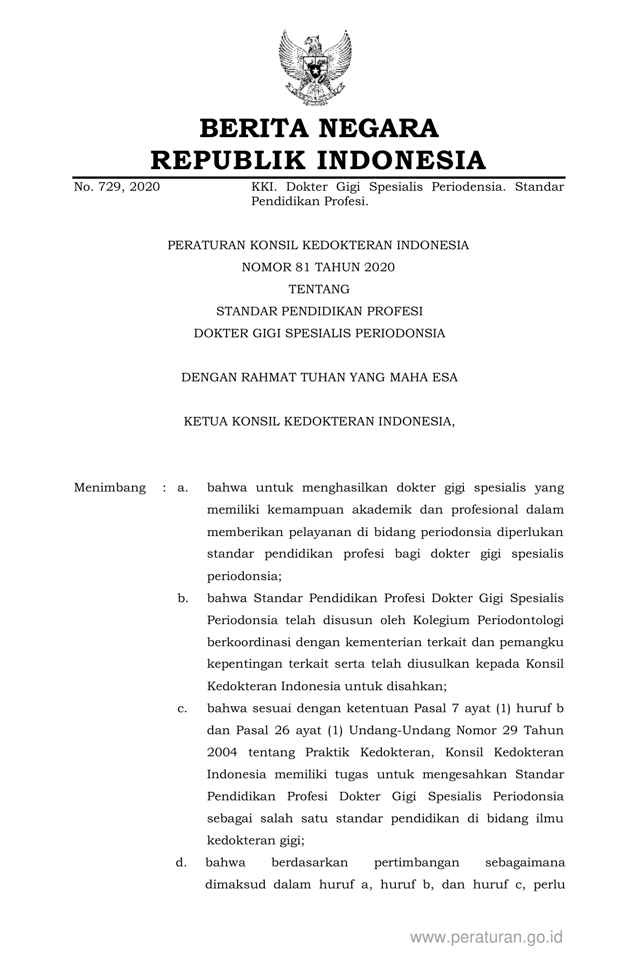PERBAN Nomor 81 Tahun 2020 | Peraturan Badan Nomor 81 Tahun 2020 tentang STANDAR PENDIDIKAN PROFESI DOKTER GIGI SPESIALIS PERIODONSIA