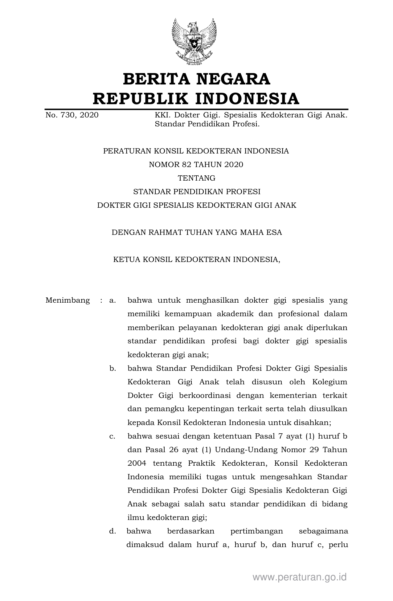 PERBAN Nomor 82 Tahun 2020 | Peraturan Badan Nomor 82 Tahun 2020 tentang STANDAR PENDIDIKAN PROFESI DOKTER GIGI SPESIALIS KEDOKTERAN GIGI ANAK