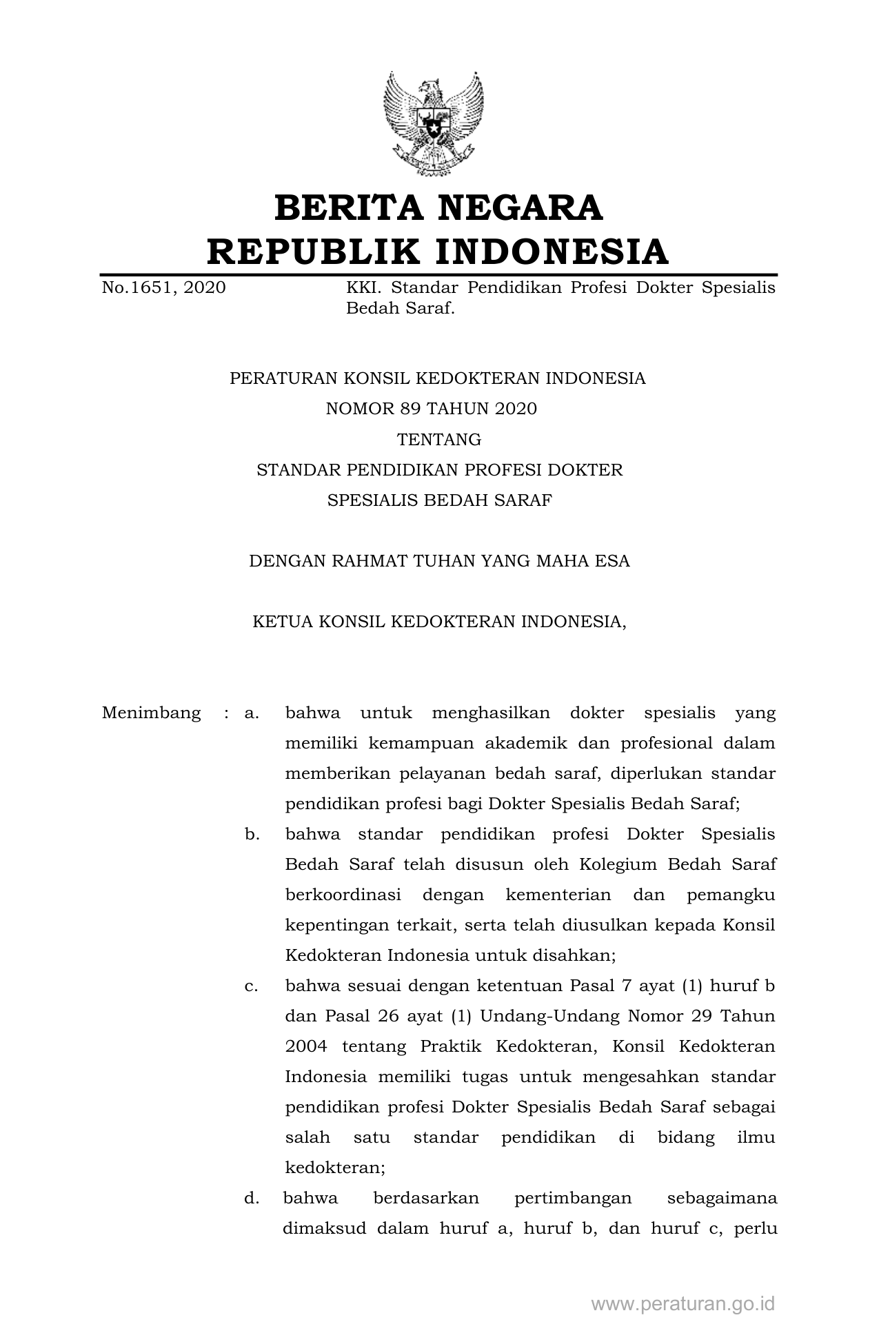 PERBAN Nomor 89 Tahun 2020 | Peraturan Badan Nomor 89 Tahun 2020 tentang STANDAR PENDIDIKAN PROFESI DOKTER SPESIALIS BEDAH SARAF