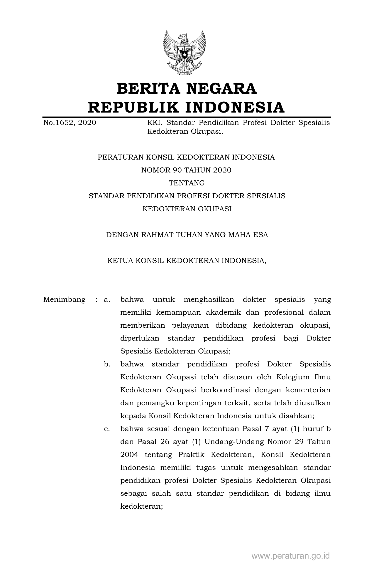 PERBAN Nomor 90 Tahun 2020 | Peraturan Badan Nomor 90 Tahun 2020 tentang STANDAR PENDIDIKAN PROFESI DOKTER SPESIALIS KEDOKTERAN OKUPASI