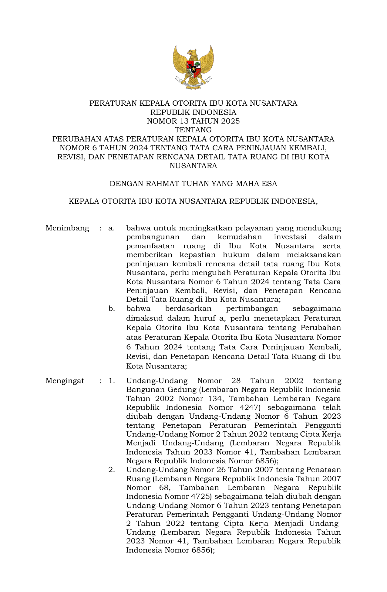 PERBAN Nomor 13 Tahun 2025 | Peraturan Badan Nomor 13 Tahun 2025 tentang PERUBAHAN ATAS PERATURAN KEPALA OTORITA IBU KOTA NUSANTARA NOMOR 6 TAHUN 2024 TENTANG TATA CARA PENINJAUAN KEMBALI REVISI DAN PENETAPAN RENCANA DETAIL TATA RUANG DI IBU KOTA NUSANTARA