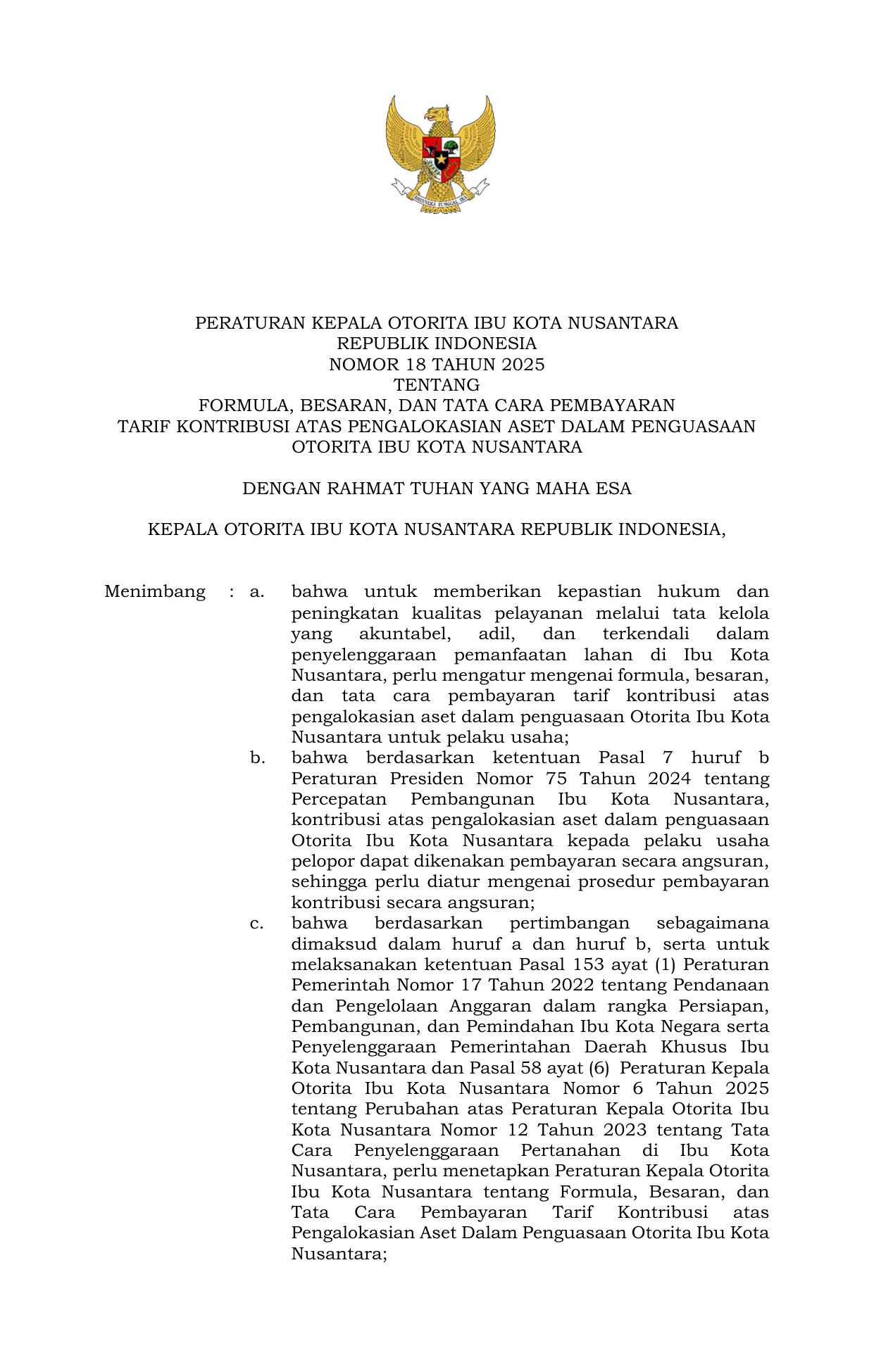 PERBAN Nomor 18 Tahun 2025 | Peraturan Badan Nomor 18 Tahun 2025 tentang FORMULA BESARAN DAN TATA CARA PEMBAYARAN TARIF KONTRIBUSI ATAS PENGALOKASIAN ASET DALAM PENGUASAAN OTORITA IBU KOTA NUSANTARA