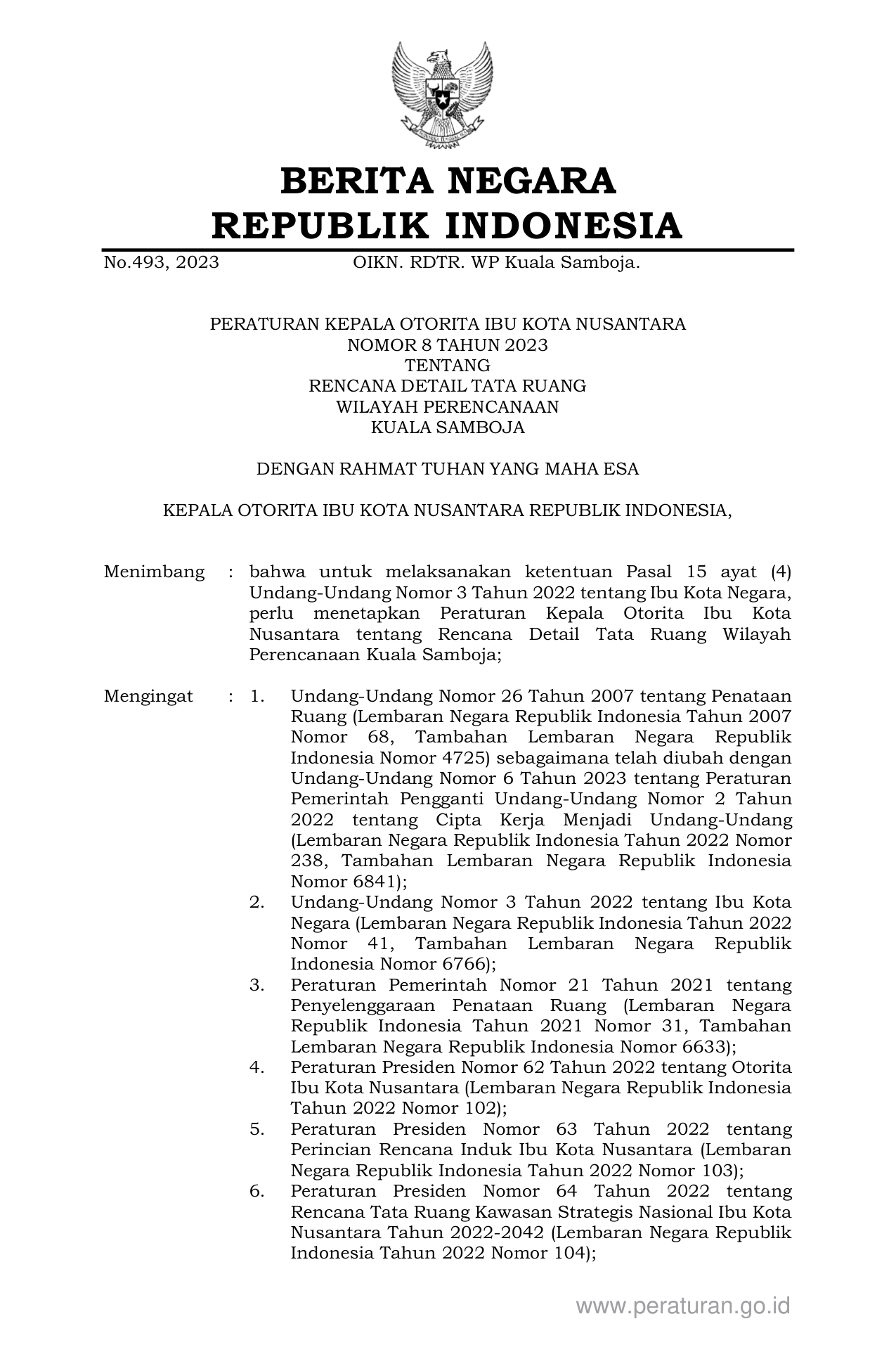 PERBAN Nomor 8 Tahun 2023 | Peraturan Badan Nomor 8 Tahun 2023 tentang RENCANA DETAIL TATA RUANG WILAYAH PERENCANAAN KUALA SAMBOJA