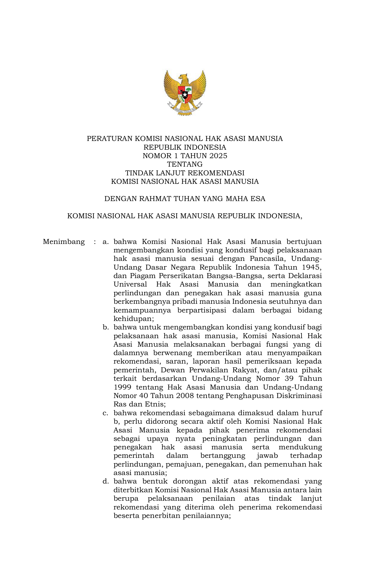 PERBAN Nomor 1 Tahun 2025 | Peraturan Badan Nomor 1 Tahun 2025 tentang Tindak Lanjut Rekomendasi Komisi Nasional Hak Asasi Manusia