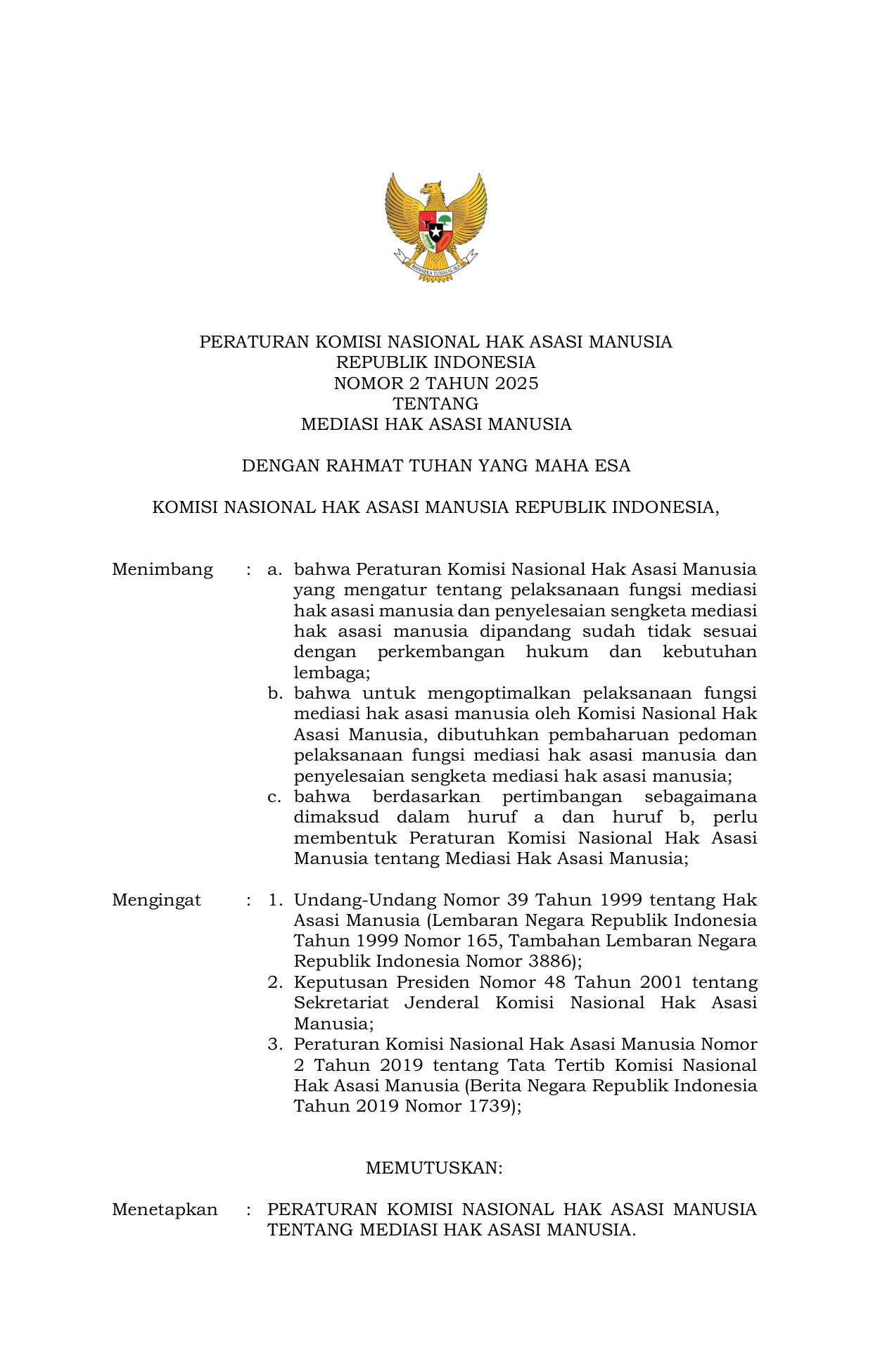 PERBAN Nomor 2 Tahun 2025 | Peraturan Badan Nomor 2 Tahun 2025 tentang Mediasi Hak Asasi Manusia