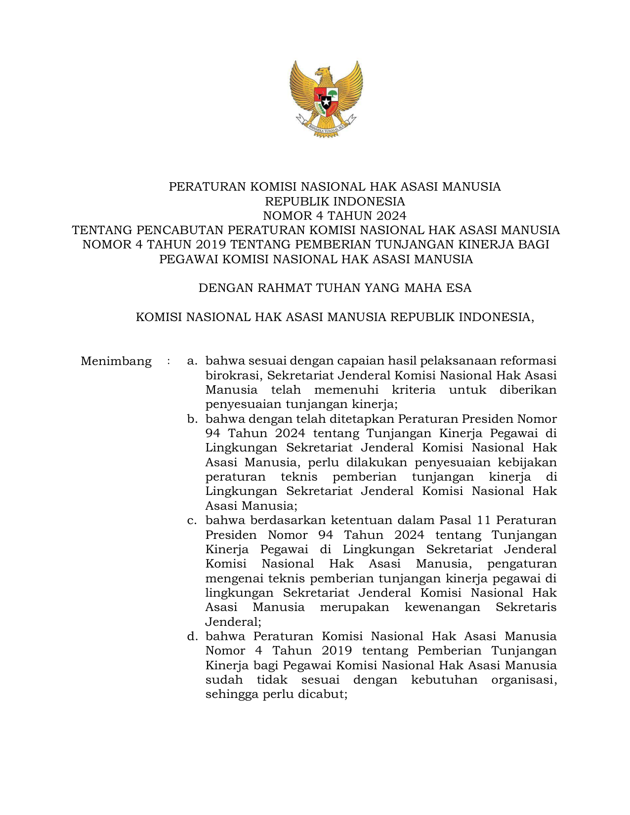 PERBAN Nomor 4 Tahun 2024 | Peraturan Badan Nomor 4 Tahun 2024 tentang Pencabutan Peraturan Komisi Nasional Hak Asasi Manusia Nomor 4 Tahun 2019 tentang Pemberian Tunjangan Kinerja bagi Pegawai Komisi Nasional Hak Asasi Manusia