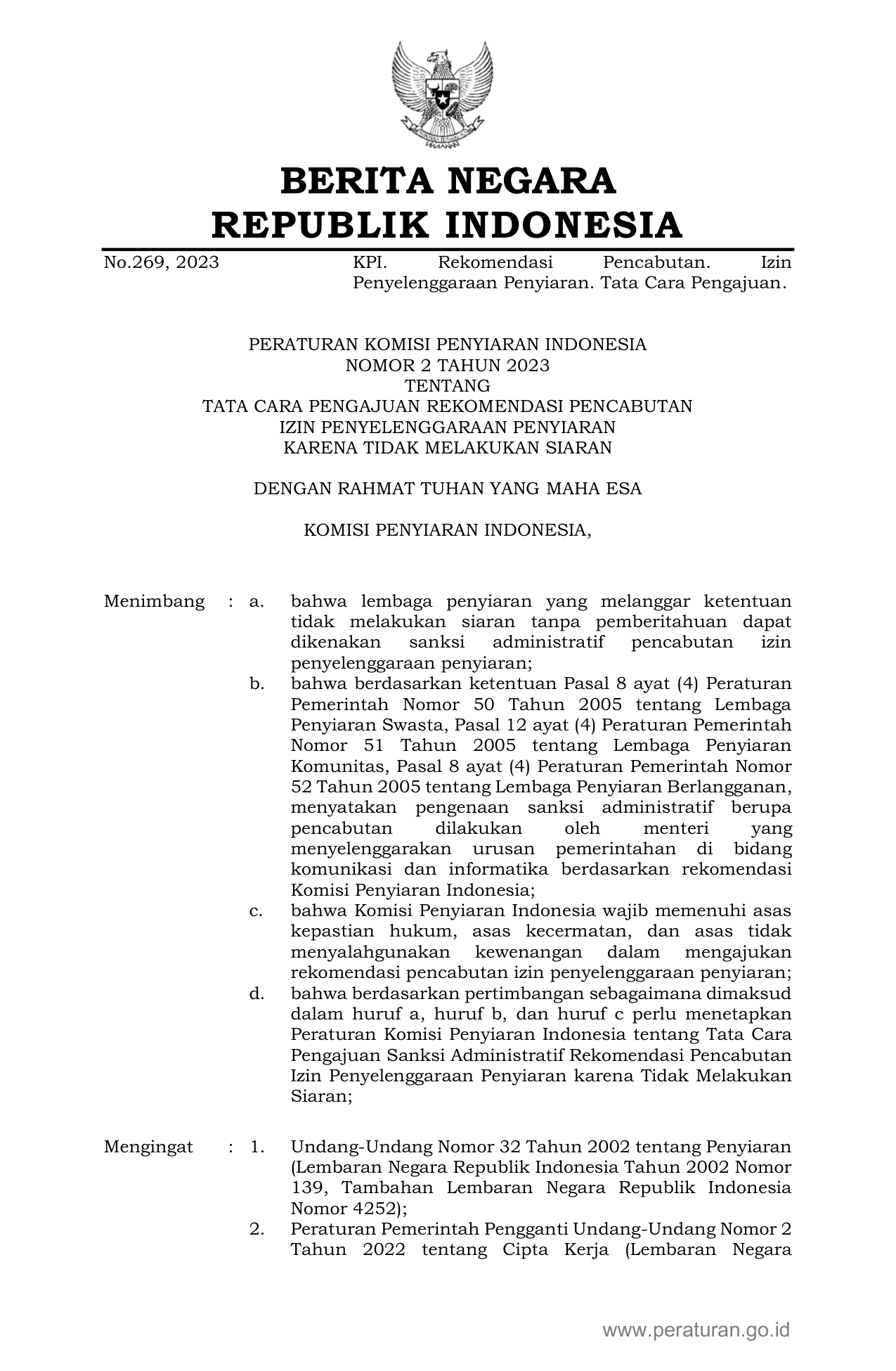 PERBAN Nomor 2 Tahun 2023 | Peraturan Badan Nomor 2 Tahun 2023 tentang TATA CARA PENGAJUAN REKOMENDASI PENCABUTAN IZIN PENYELENGGARAAN PENYIARANKARENA TIDAK MELAKUKAN SIARAN