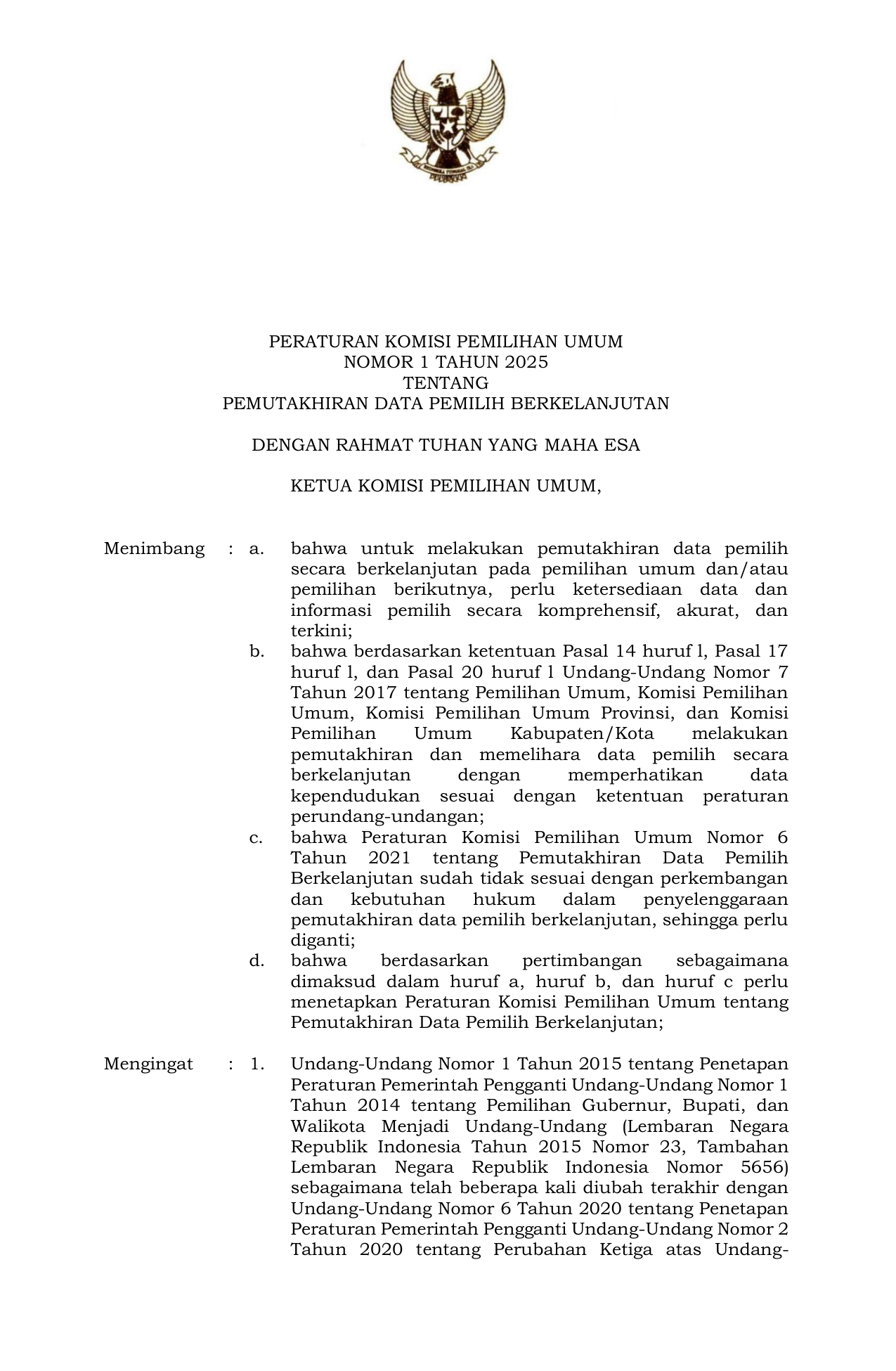 PERATURAN KOMISI PEMILIHAN UMUM NOMOR 1 TAHUN 2025 TENTANG PEMUTAKHIRAN DATA PEMILIH BERKELANJUTAN
