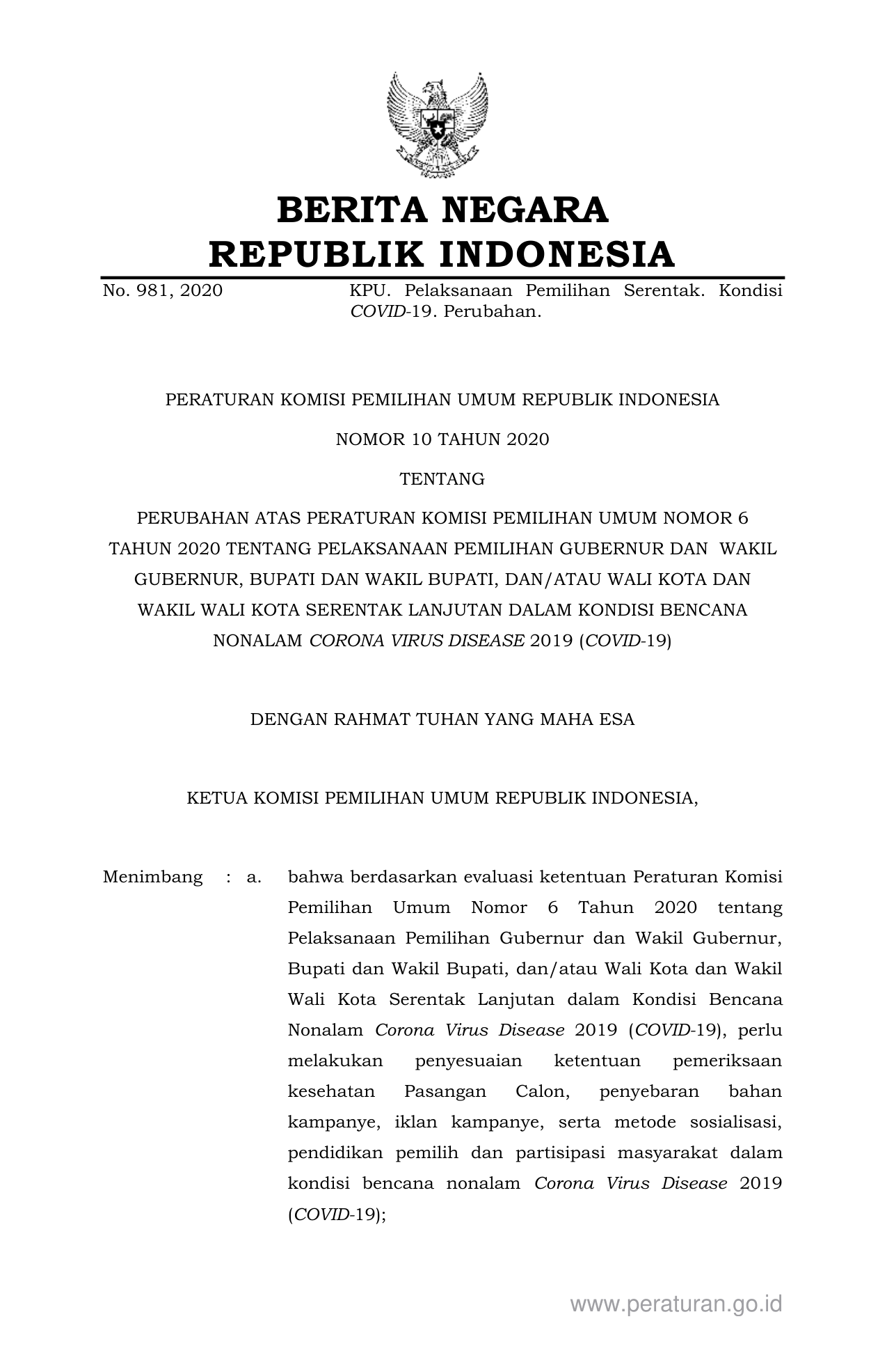 PERBAN Nomor 10 Tahun 2020 | Peraturan Badan Nomor 10 Tahun 2020 tentang PERUBAHAN ATAS PERATURAN KOMISI PEMILIHAN UMUM NOMOR 6TAHUN 2020 TENTANG PELAKSANAAN PEMILIHAN GUBERNUR DAN WAKIL GUBERNUR, BUPATI DAN WAKIL BUPATI, DAN/ATAU WALI KOTA DAN WAKIL WALI KOTA SERENTAK LANJUTAN DALAM KONDISI BENCANANONALAM CORONA VIRUS DISEASE 2019 (COVID-19)