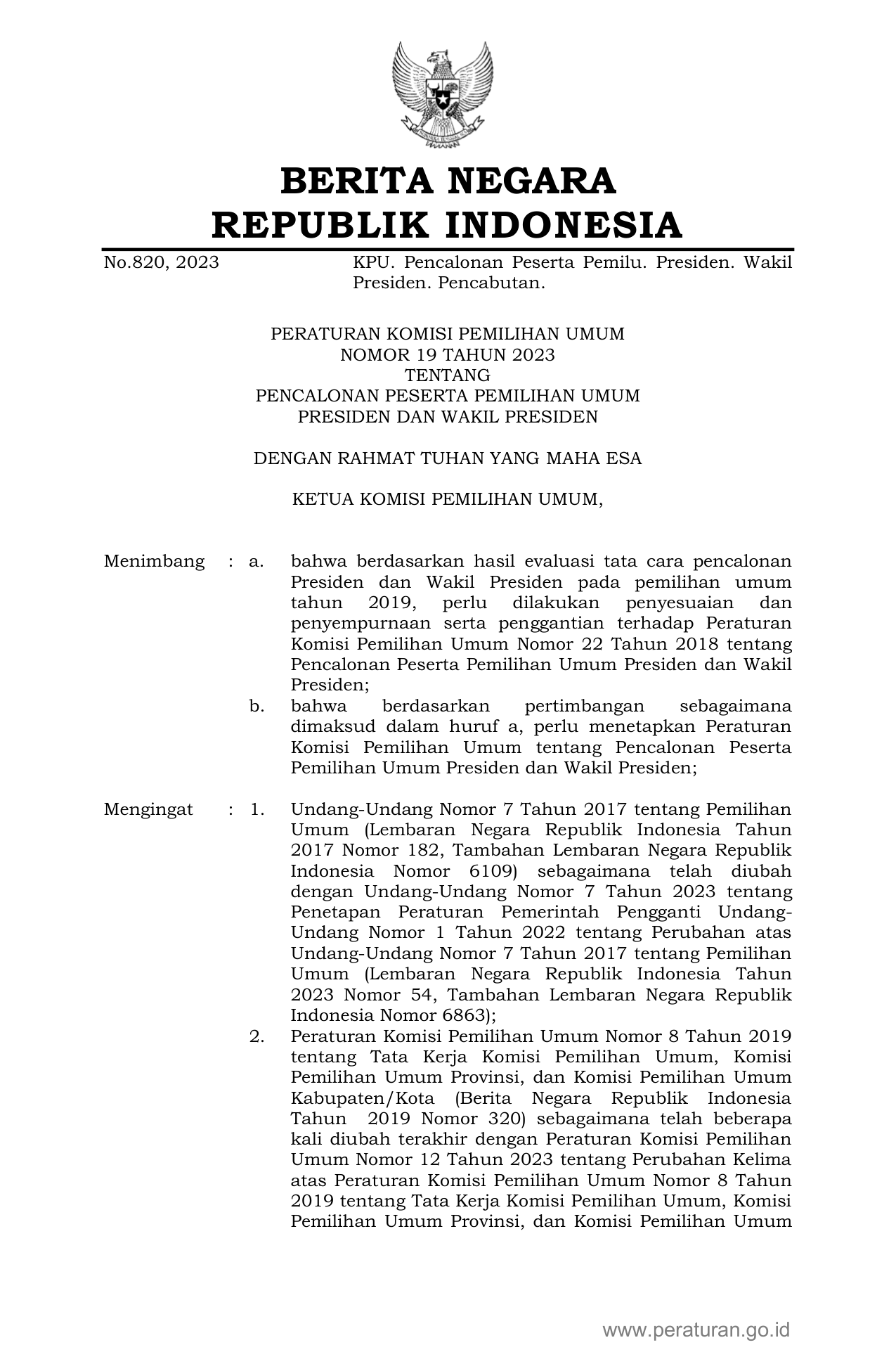 PERBAN Nomor 19 Tahun 2023 | Peraturan Badan Nomor 19 Tahun 2023 tentang PENCALONAN PESERTA PEMILIHAN UMUM PRESIDEN DAN WAKIL PRESIDEN