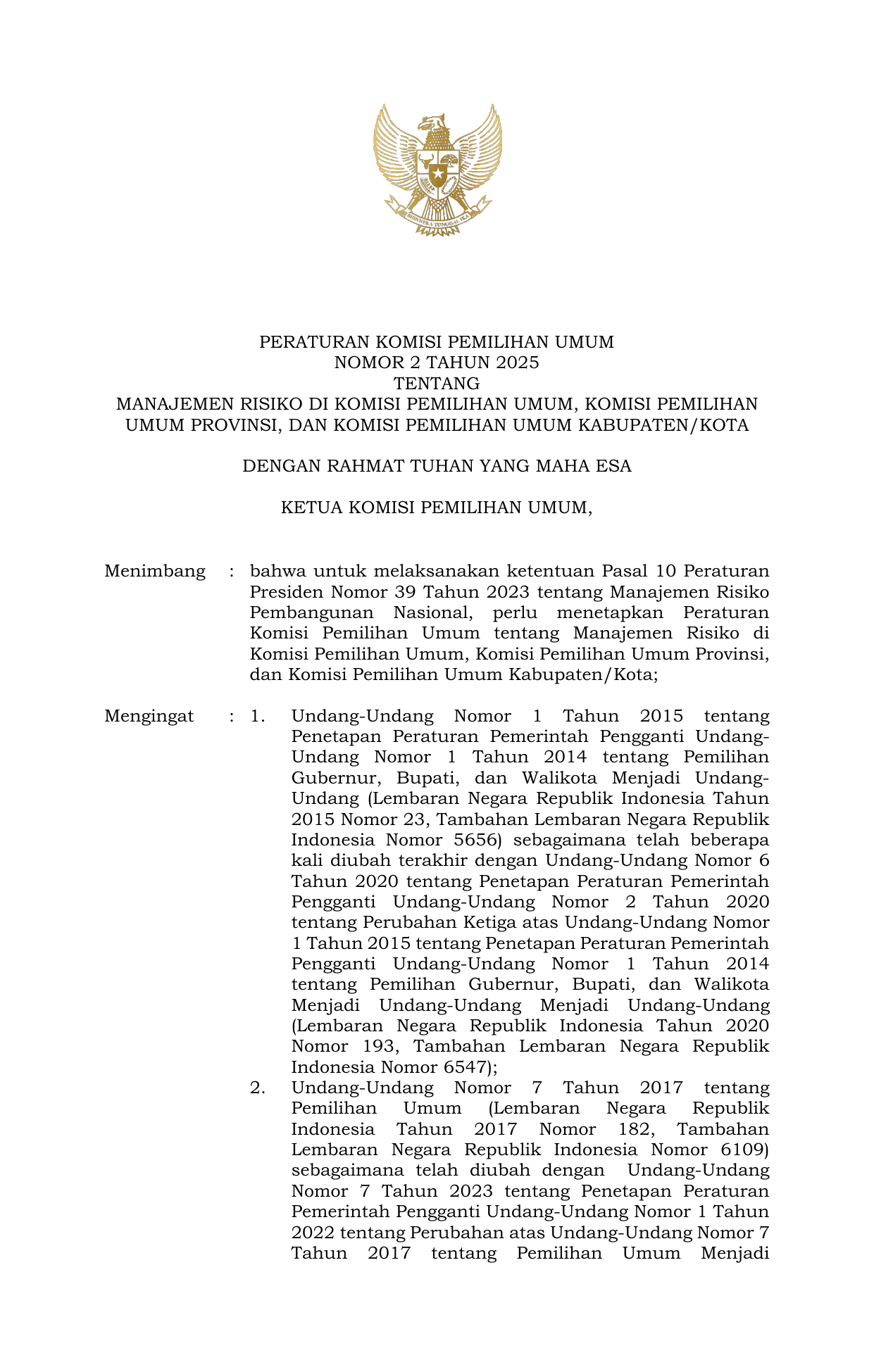 PERBAN Nomor 2 Tahun 2025 | Peraturan Badan Nomor 2 Tahun 2025 tentang Manajemen Risiko di Komisi Pemilihan Umum Komisi Pemilihan Umum Provinsi dan Komisi Pemilihan Umum Kabupaten Kota