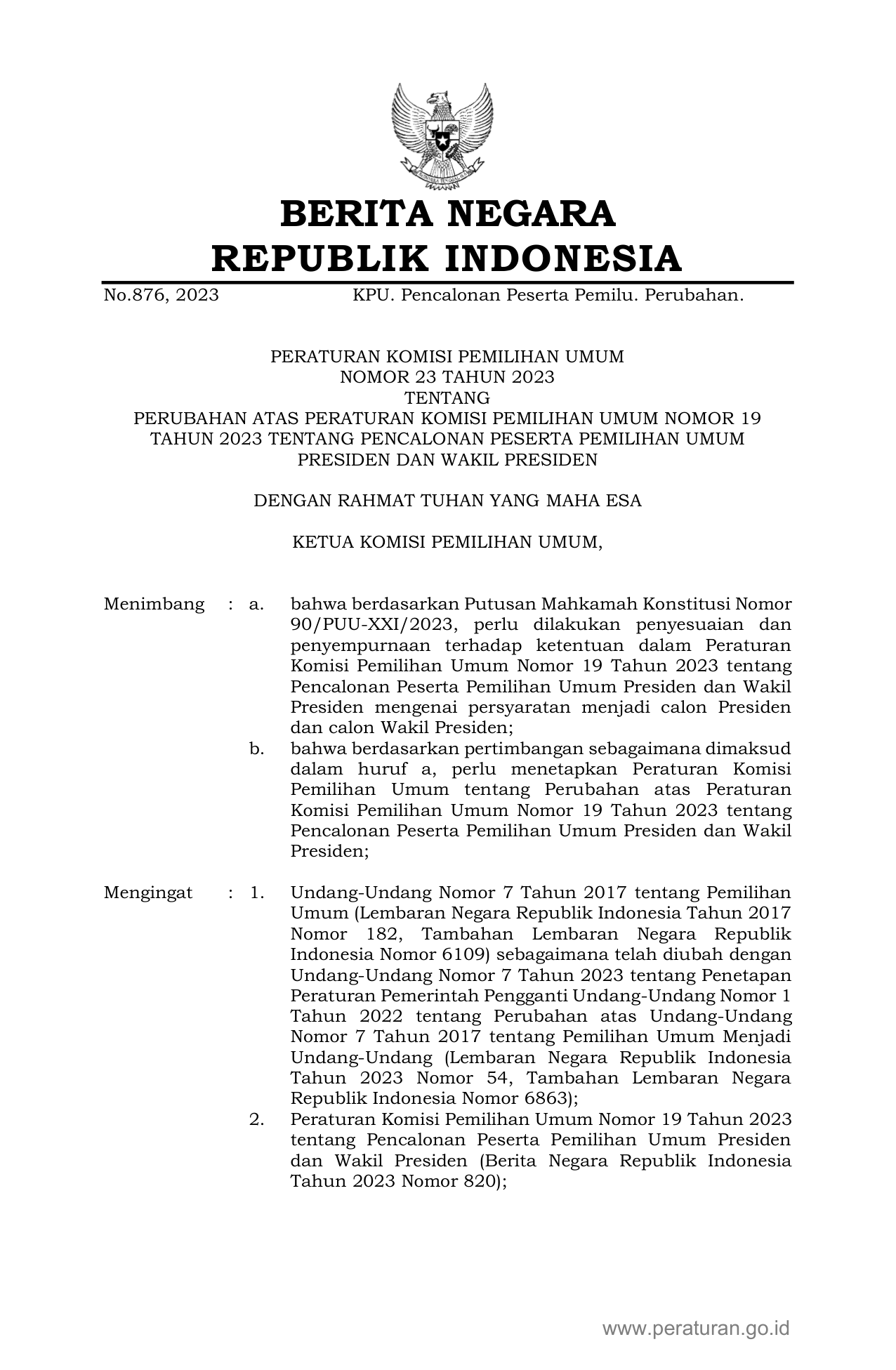 PERBAN Nomor 23 Tahun 2023 | Peraturan Badan Nomor 23 Tahun 2023 tentang PERUBAHAN ATAS PERATURAN KOMISI PEMILIHAN UMUM NOMOR 19 TAHUN 2023 TENTANG PENCALONAN PESERTA PEMILIHAN UMUM PRESIDEN DAN WAKIL PRESIDEN