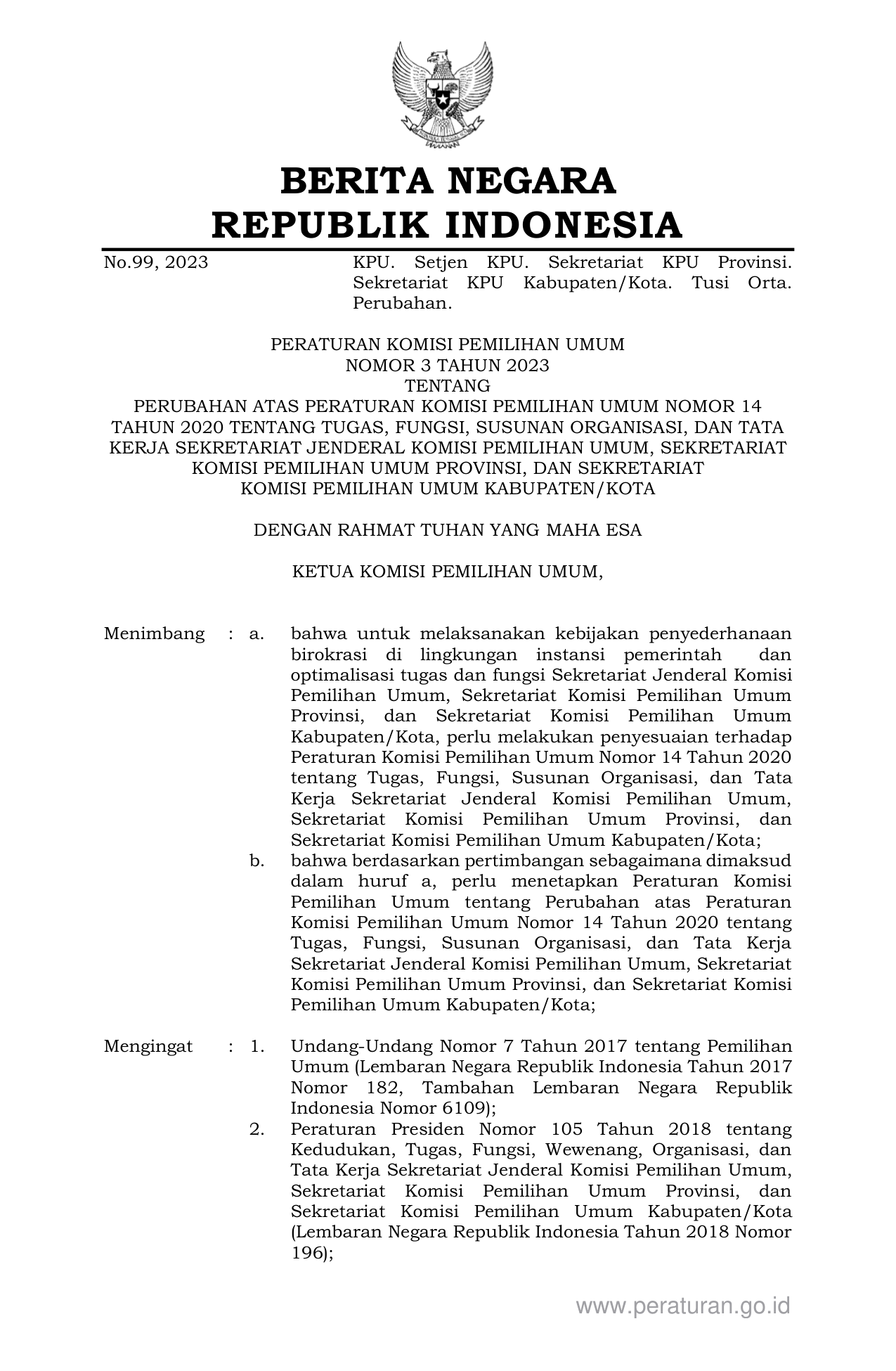 PERBAN Nomor 3 Tahun 2023 | Peraturan Badan Nomor 3 Tahun 2023 tentang PERUBAHAN ATAS PERATURAN KOMISI PEMILIHAN UMUM NOMOR 14 TAHUN 2020 TENTANG TUGAS, FUNGSI, SUSUNAN ORGANISASI, DAN TATA KERJA SEKRETARIAT JENDERAL KOMISI PEMILIHAN UMUM, SEKRETARIAT KOMISI PEMILIHAN UMUM PROVINSI, DAN SEKRETARIAT KOMISI PEMILIHAN UMUM KABUPATEN/KOTA