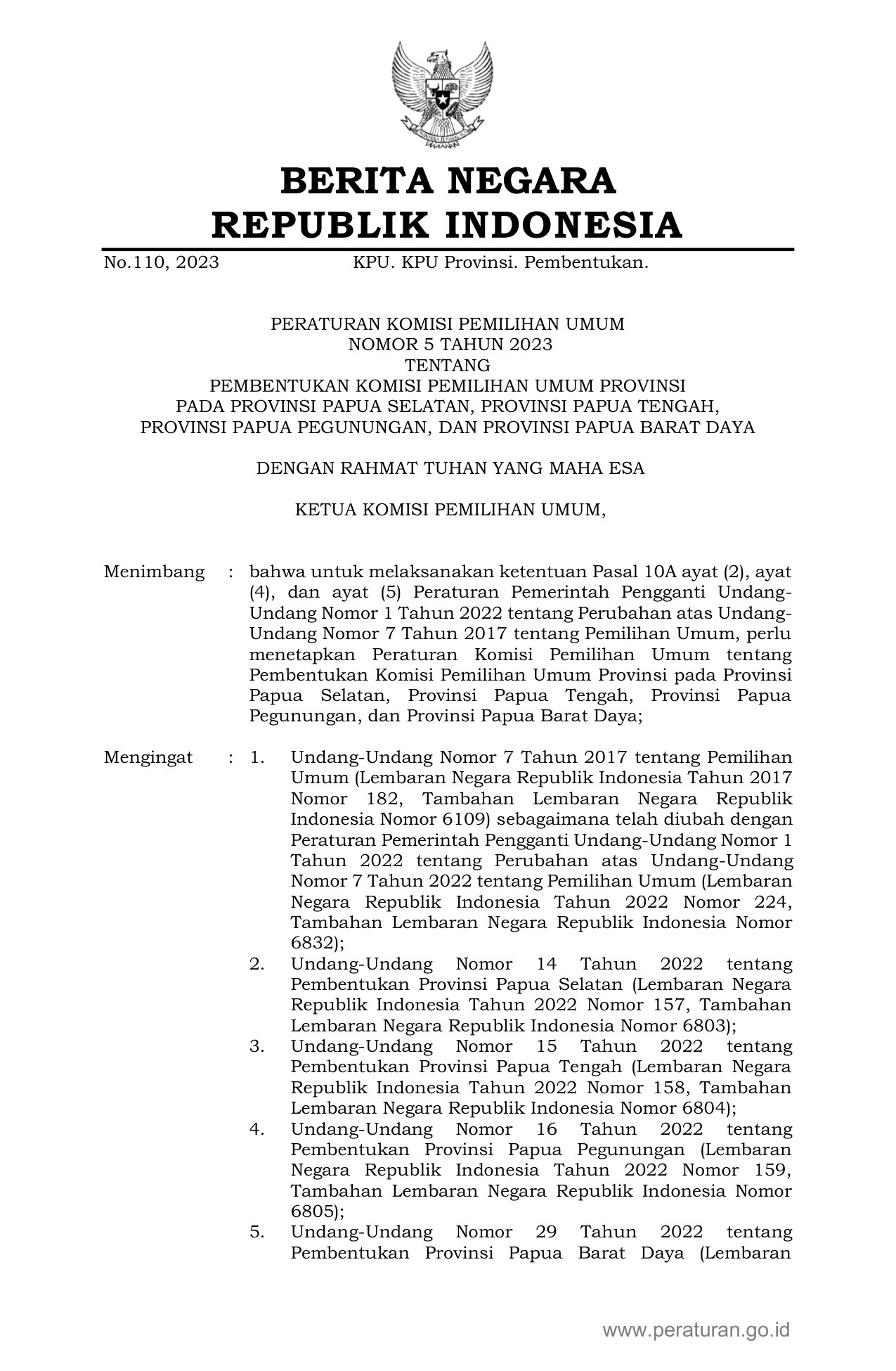 PERBAN Nomor 5 Tahun 2023 | Peraturan Badan Nomor 5 Tahun 2023 tentang PEMBENTUKAN KOMISI PEMILIHAN UMUM PROVINSI PADA PROVINSI PAPUA SELATAN, PROVINSI PAPUA TENGAH, PROVINSI PAPUA PEGUNUNGAN, DAN PROVINSI PAPUA BARAT DAYA