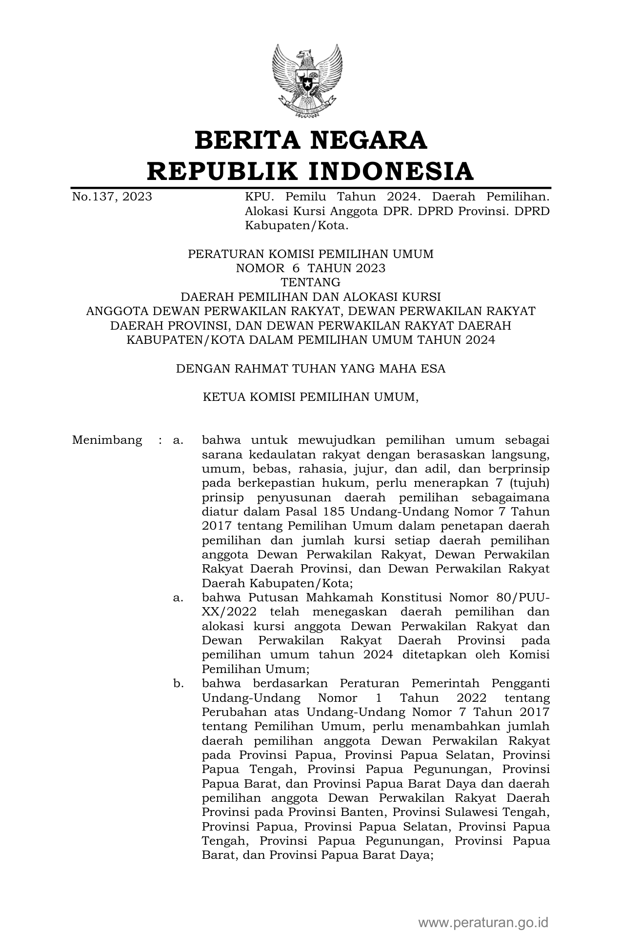 PERBAN Nomor 6 Tahun 2023 | Peraturan Badan Nomor 6 Tahun 2023 tentang DAERAH PEMILIHAN DAN ALOKASI KURSI ANGGOTA DEWAN PERWAKILAN RAKYAT, DEWAN PERWAKILAN RAKYATDAERAH PROVINSI, DAN DEWAN PERWAKILAN RAKYAT DAERAH KABUPATEN/KOTA DALAM PEMILIHAN UMUM TAHUN 2024