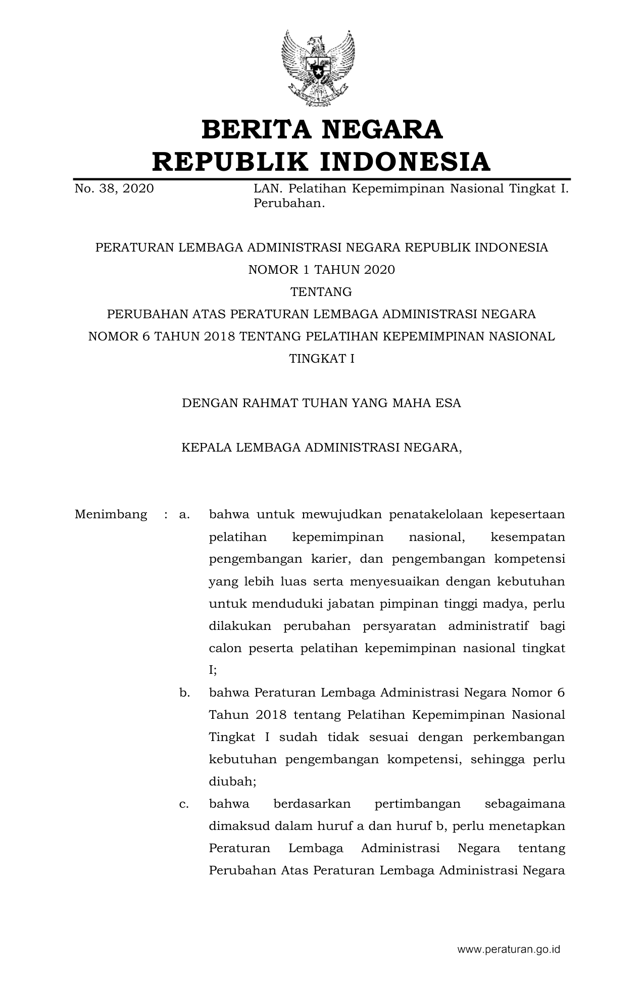 PERBAN Nomor 1 Tahun 2020 | Peraturan Badan Nomor 1 Tahun 2020 tentang PERUBAHAN ATAS PERATURAN LEMBAGA ADMINISTRASI NEGARA NOMOR 6 TAHUN 2018 TENTANG PELATIHAN KEPEMIMPINAN NASIONAL TINGKAT I