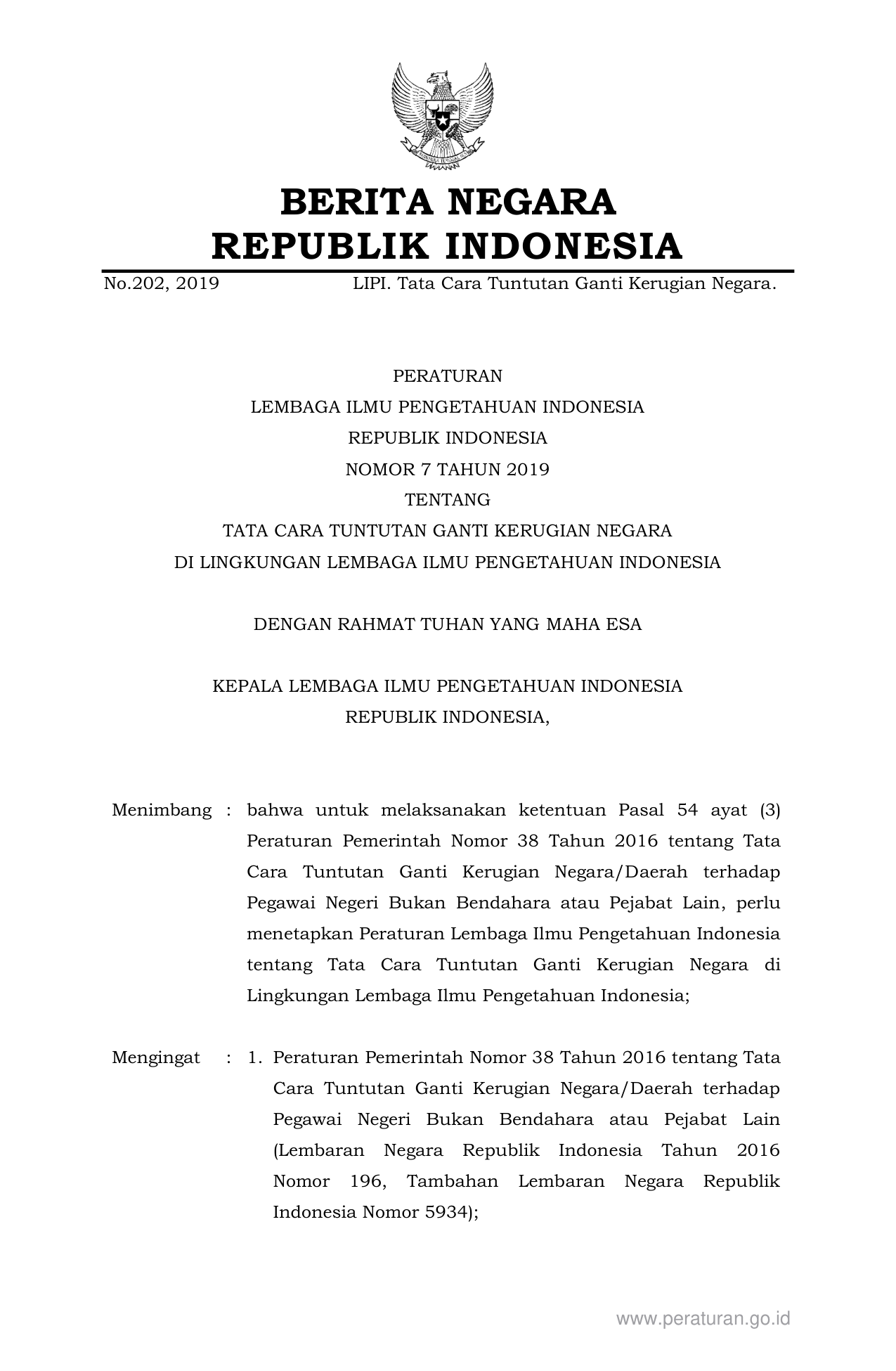 PERBAN Nomor 7 Tahun 2019 | Peraturan Badan Nomor 7 Tahun 2019 tentang Tata Cara Tuntutan Ganti Kerugian Negara Di Lingkungan Lembaga Ilmu Pengetahuan Indonesia