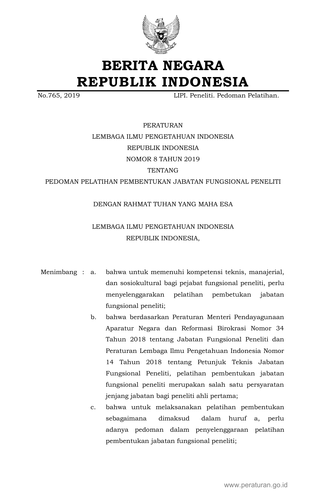 PERBAN Nomor 8 Tahun 2019 | Peraturan Badan Nomor 8 Tahun 2019 tentang PEDOMAN PELATIHAN PEMBENTUKAN JABATAN FUNGSIONAL PENELITI