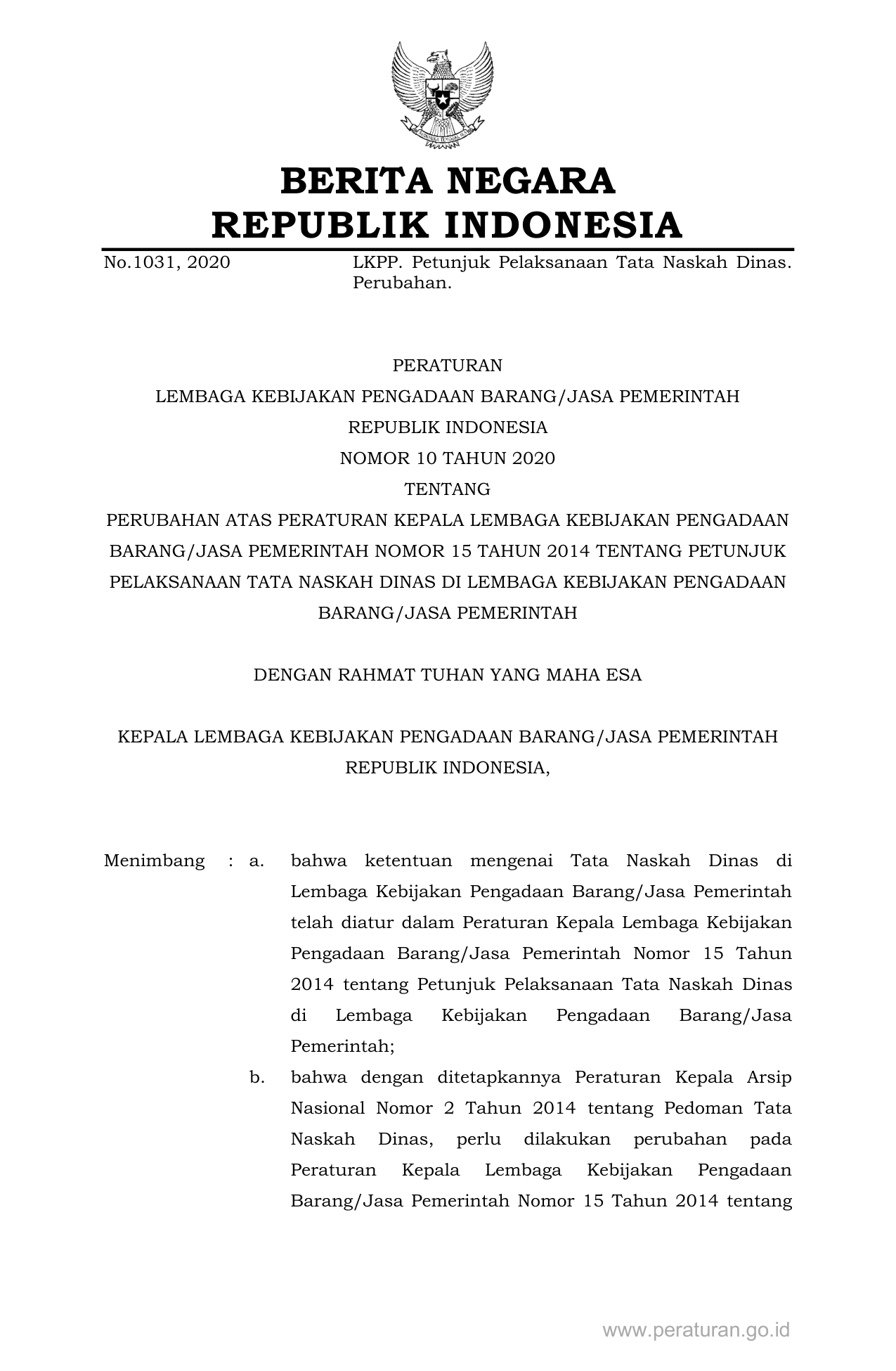 PERBAN Nomor 10 Tahun 2020 | Peraturan Badan Nomor 10 Tahun 2020 tentang PERUBAHAN ATAS PERATURAN KEPALA LEMBAGA KEBIJAKAN PENGADAAN BARANG/JASA PEMERINTAH NOMOR 15 TAHUN 2014 TENTANG PETUNJUK PELAKSANAAN TATA NASKAH DINAS DI LEMBAGA KEBIJAKAN PENGADAAN BARANG/JASA PEMERINTAH