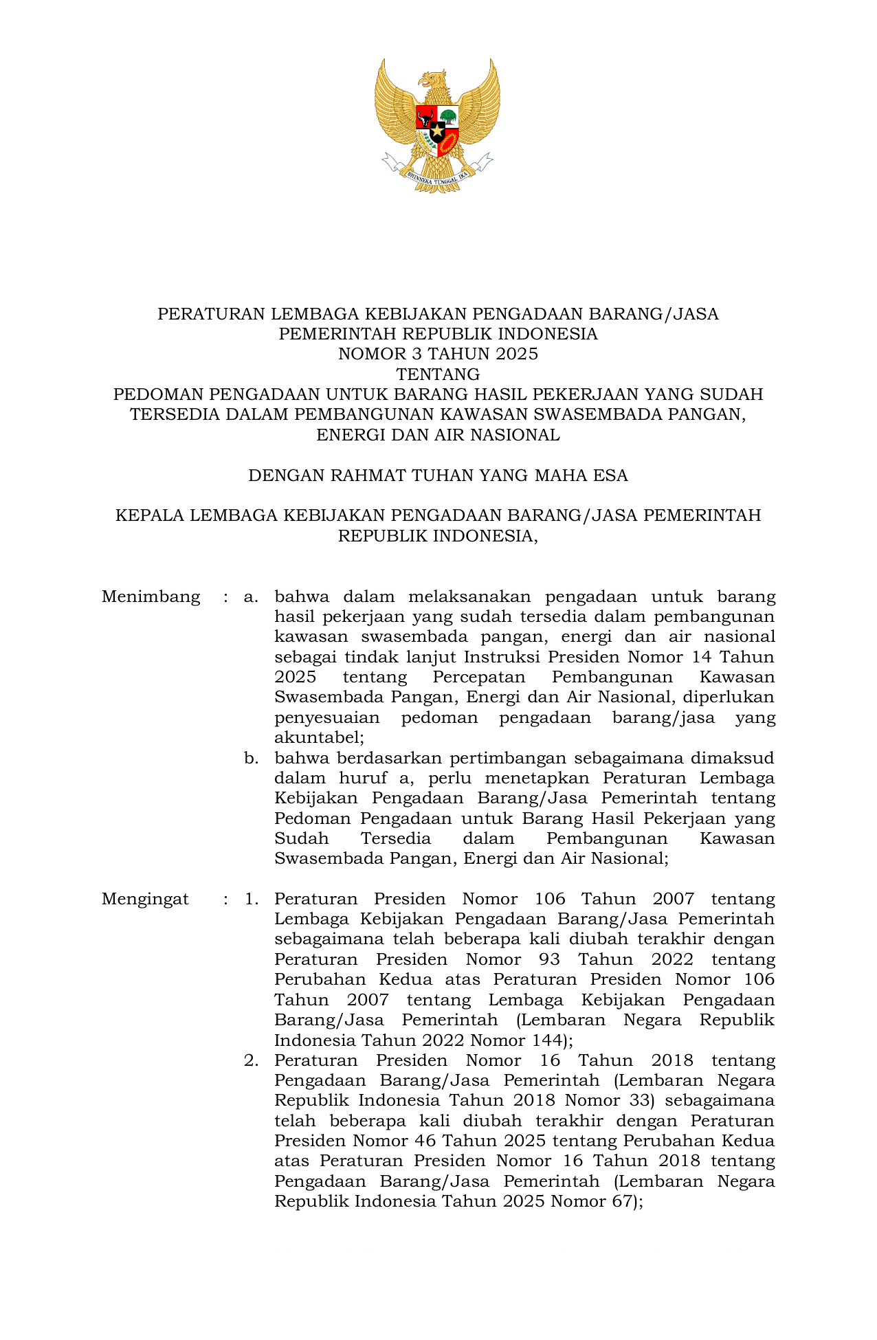 PERBAN Nomor 3 Tahun 2025 | Peraturan Badan Nomor 3 Tahun 2025 tentang Pedoman Pengadaan untuk Barang Hasil Pekerjaan yang Sudah Tersedia dalam Pembangunan Kawasan Swasembada Pangan Energi dan Air Nasional