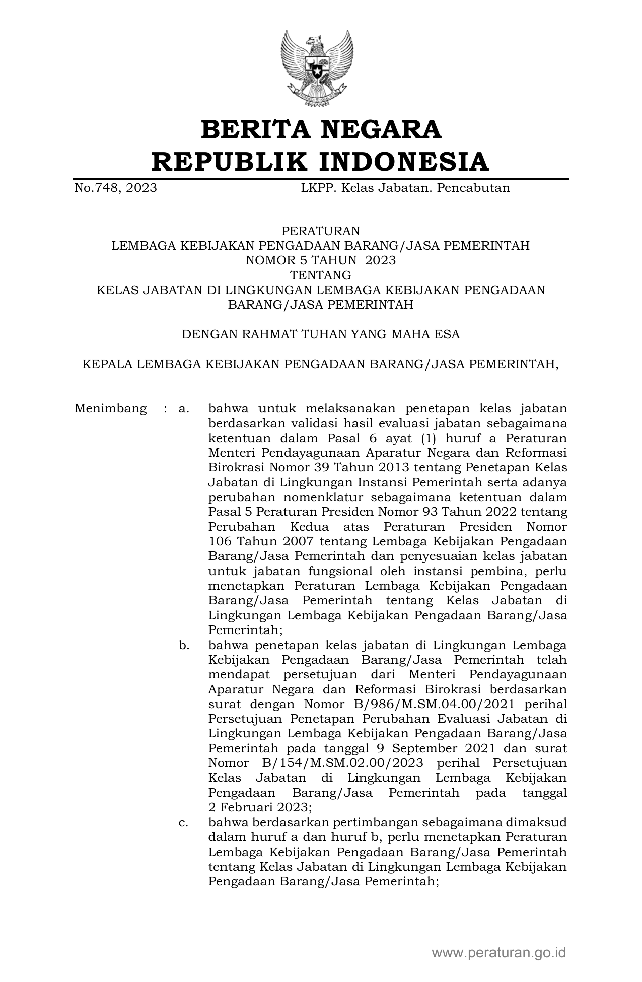 PERBAN Nomor 5 Tahun 2023 | Peraturan Badan Nomor 5 Tahun 2023 tentang KELAS JABATAN DI LINGKUNGAN LEMBAGA KEBIJAKAN PENGADAAN BARANG/JASA PEMERINTAH