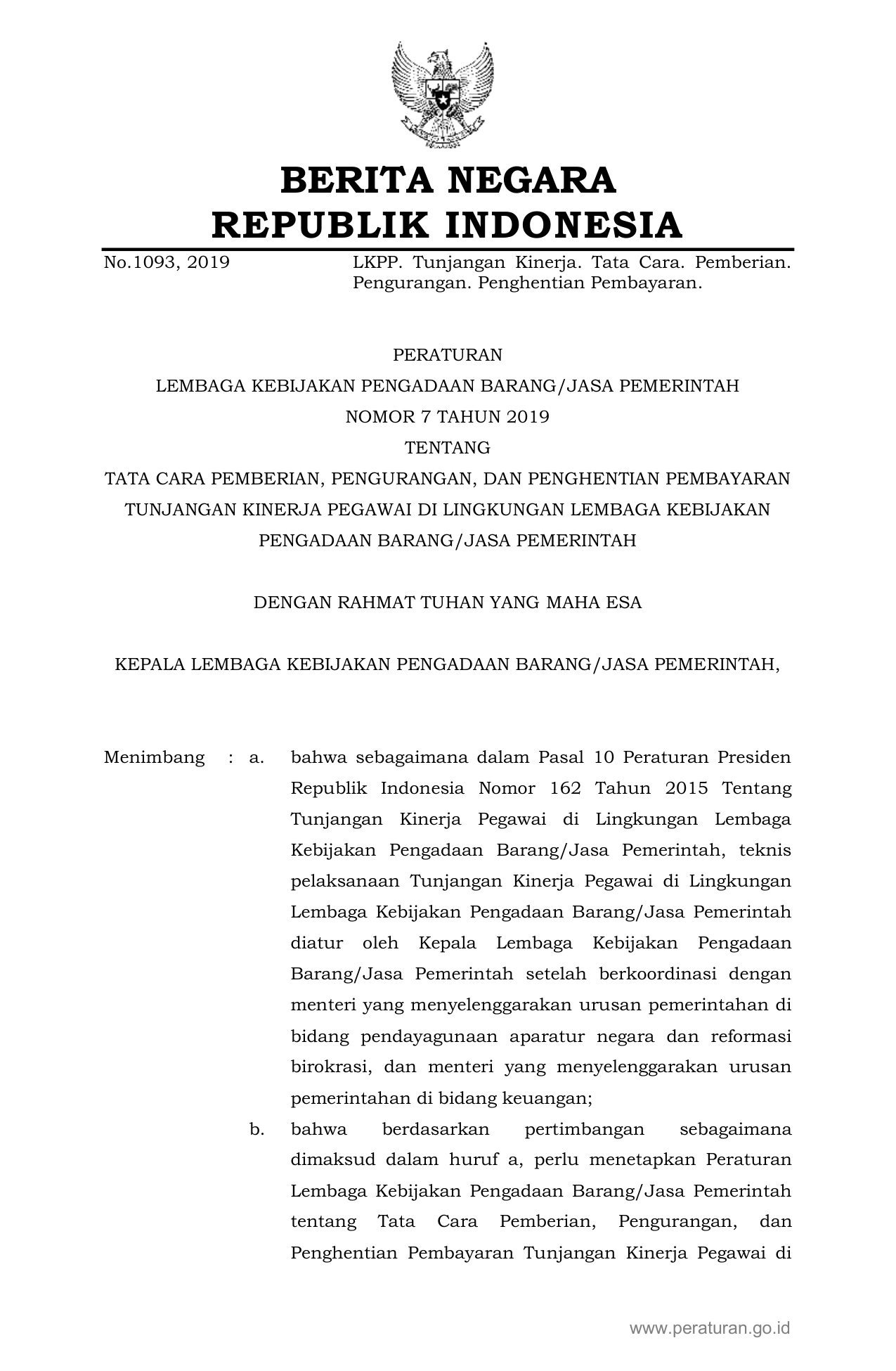 PERBAN Nomor 7 Tahun 2019 | Peraturan Badan Nomor 7 Tahun 2019 tentang TATA CARA PEMBERIAN, PENGURANGAN, DAN PENGHENTIAN PEMBAYARAN TUNJANGAN KINERJA PEGAWAI DI LINGKUNGAN LEMBAGA KEBIJAKAN PENGADAAN BARANG/JASA PEMERINTAH