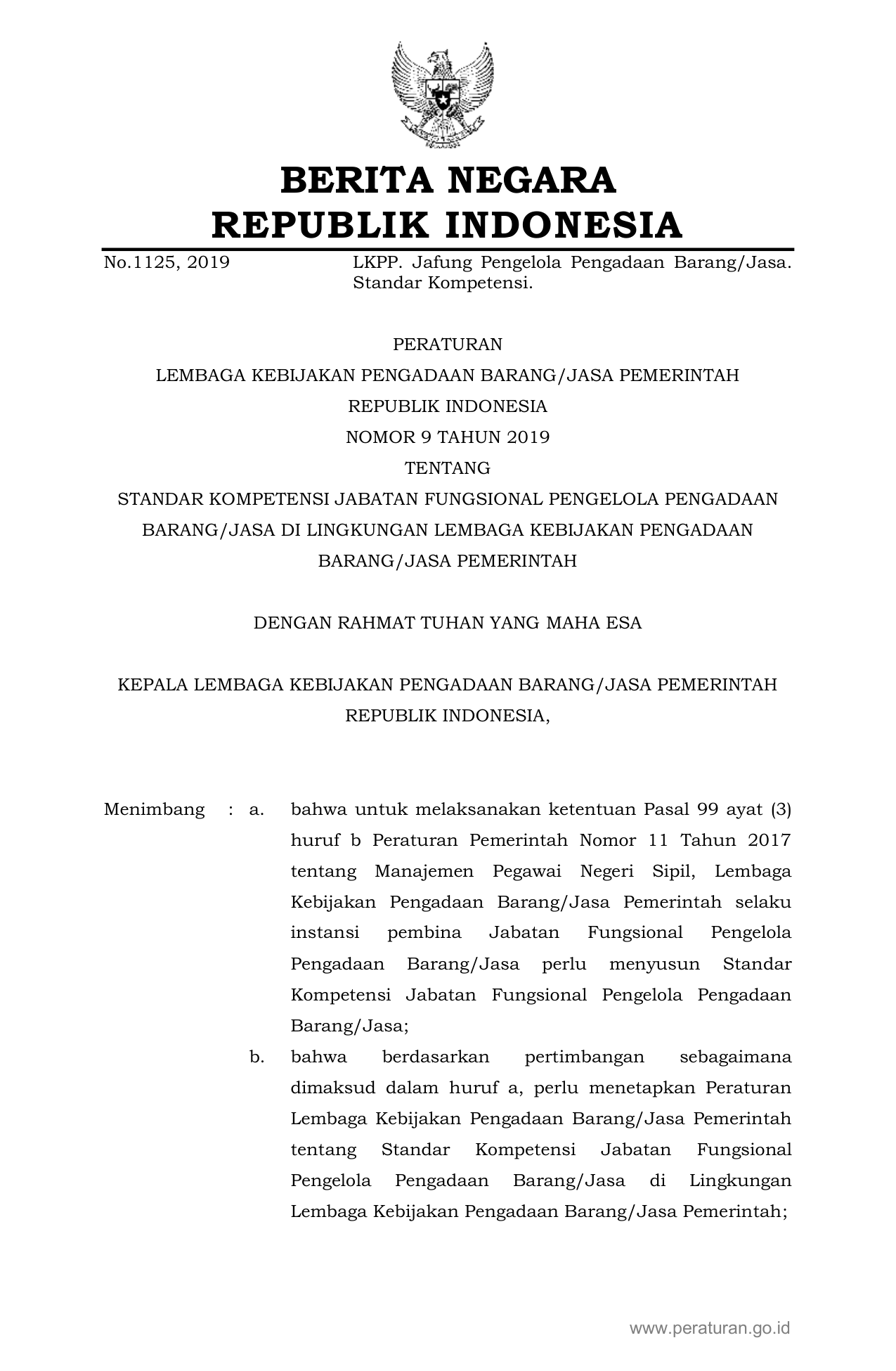 PERBAN Nomor 9 Tahun 2019 | Peraturan Badan Nomor 9 Tahun 2019 tentang STANDAR KOMPETENSI JABATAN FUNGSIONAL PENGELOLA PENGADAAN BARANG/JASA DI LINGKUNGAN LEMBAGA KEBIJAKAN PENGADAAN BARANG/JASA PEMERINTAH