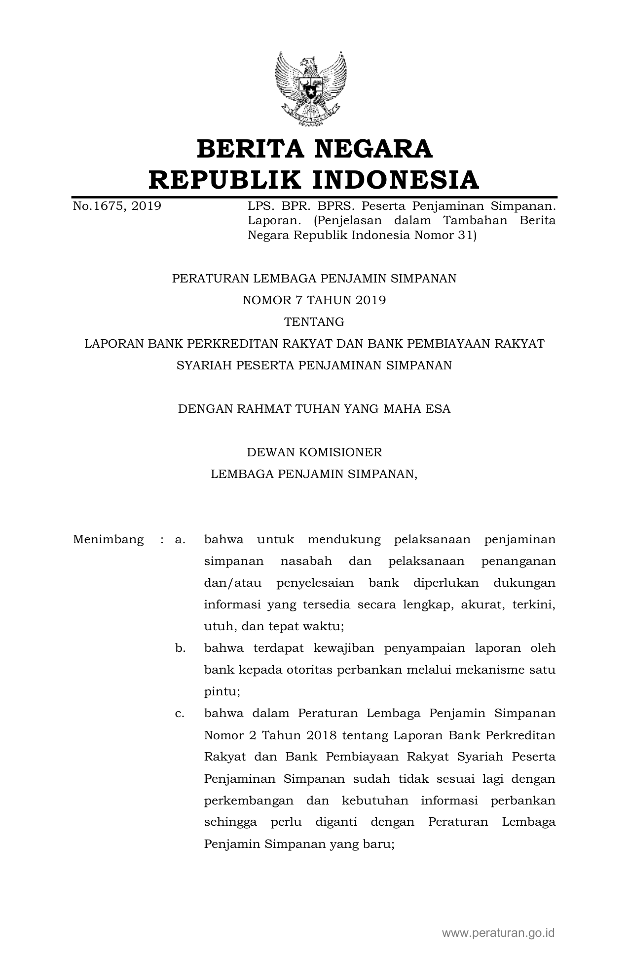 PERBAN Nomor 7 Tahun 2019 | Peraturan Badan Nomor 7 Tahun 2019 tentang LAPORAN BANK PERKREDITAN RAKYAT DAN BANK PEMBIAYAAN RAKYATSYARIAH PESERTA PENJAMINAN SIMPANAN