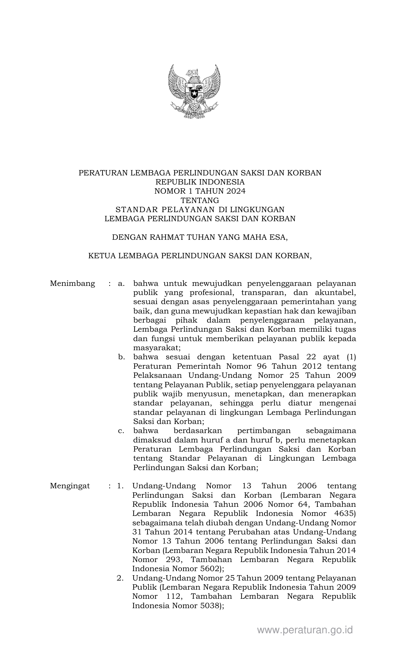 PERBAN Nomor 1 Tahun 2024 | Peraturan Badan Nomor 1 Tahun 2024 tentang STANDAR PELAYANAN DI LINGKUNGAN LEMBAGA PERLINDUNGAN SAKSI DAN KORBAN