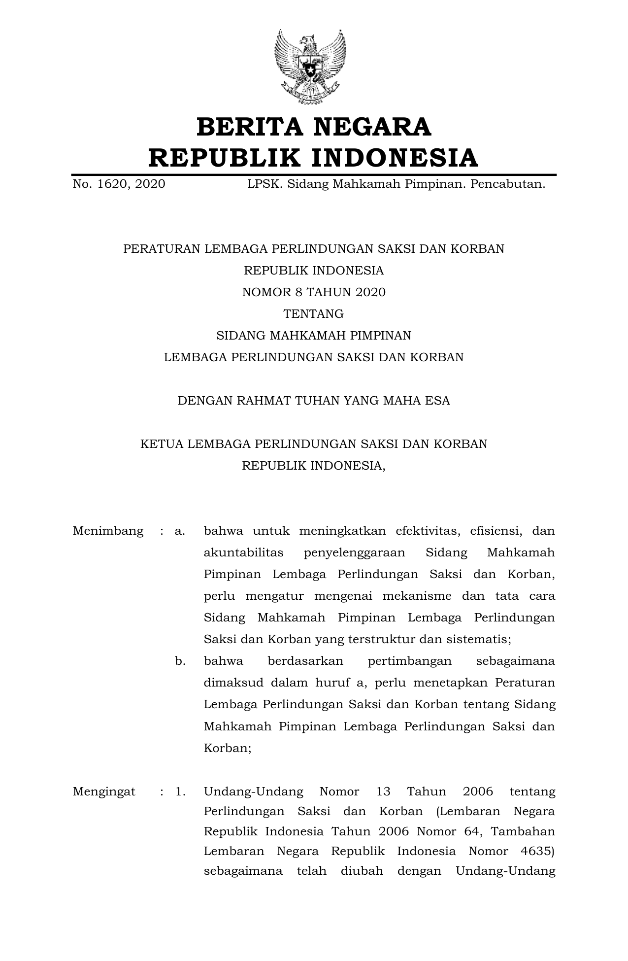PERBAN Nomor 8 Tahun 2020 | Peraturan Badan Nomor 8 Tahun 2020 tentang SIDANG MAHKAMAH PIMPINAN LEMBAGA PERLINDUNGAN SAKSI DAN KORBAN
