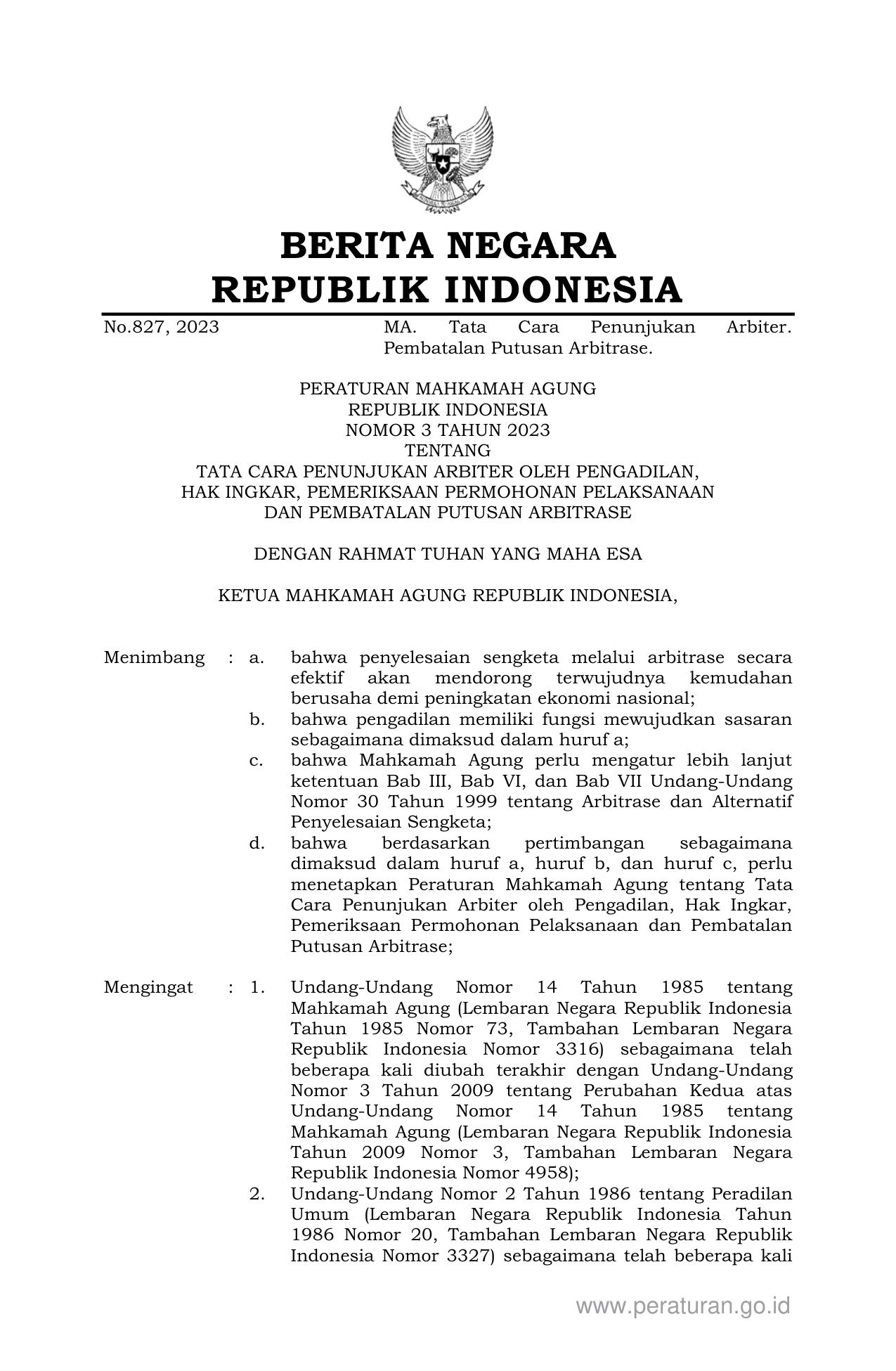PERBAN Nomor 3 Tahun 2023 | Peraturan Badan Nomor 3 Tahun 2023 tentang TATA CARA PENUNJUKAN ARBITER OLEH PENGADILAN, HAK INGKAR, PEMERIKSAAN PERMOHONAN PELAKSANAAN DAN PEMBATALAN PUTUSAN ARBITRASE