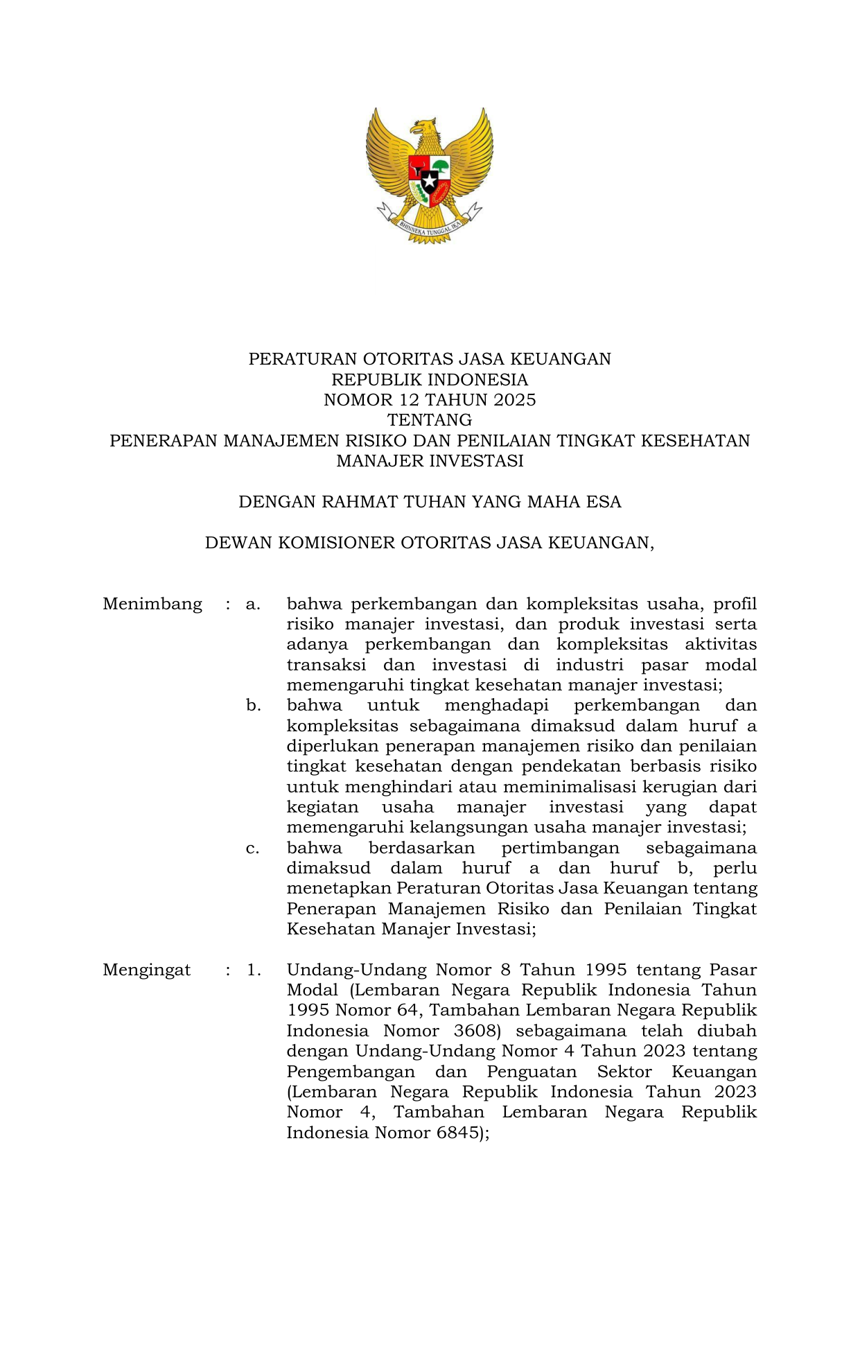PERBAN Nomor 12 Tahun 2025 | Peraturan Badan Nomor 12 Tahun 2025 tentang Penerapan Manajemen Risiko dan Penilaian Tingkat Kesehatan Manajer Investasi