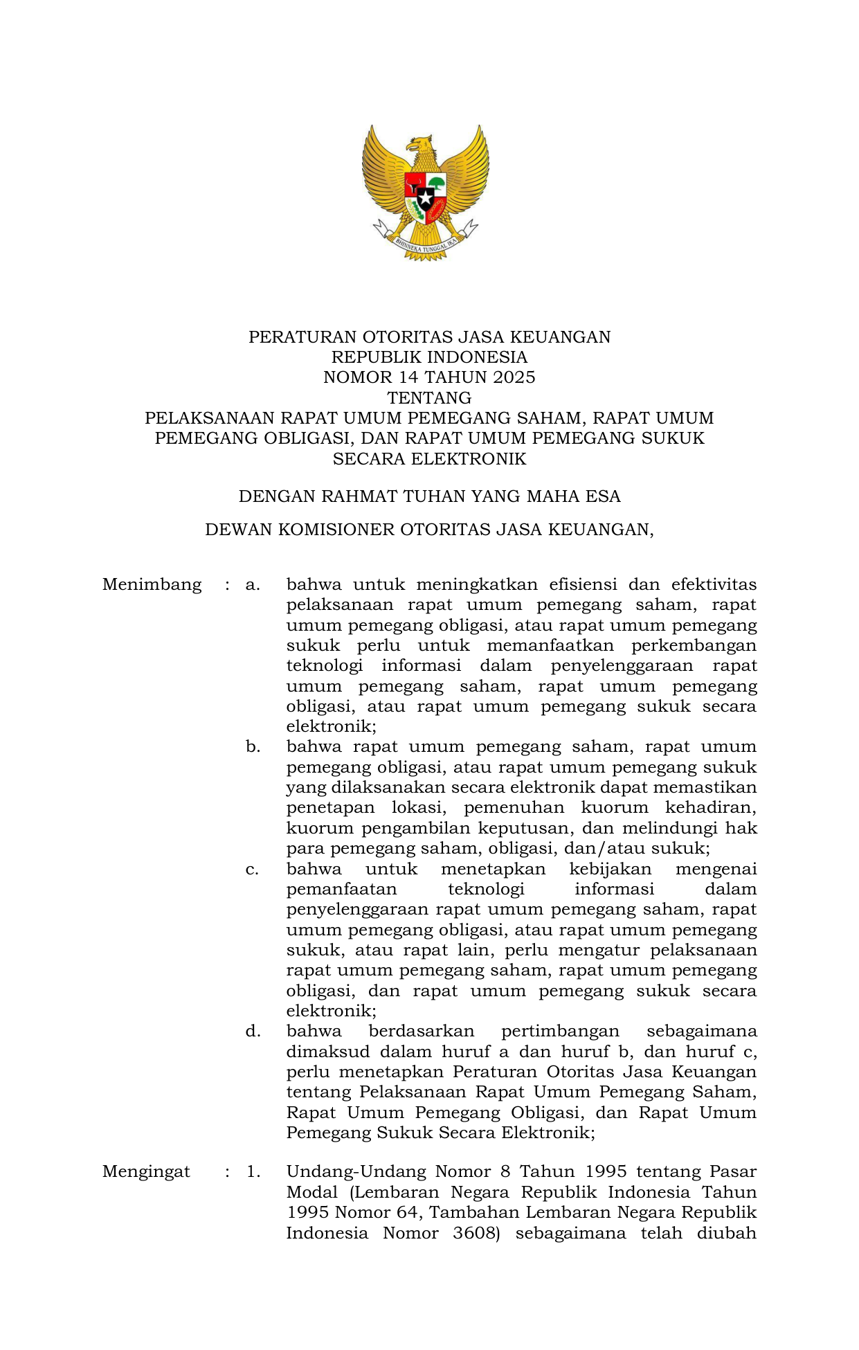 PERBAN Nomor 14 Tahun 2025 | Peraturan Badan Nomor 14 Tahun 2025 tentang Pelaksanaan Rapat Umum Pemegang Saham Rapat Umum Pemegang Obligasi dan Rapat Umum Pemegang Sukuk Secara Elektronik