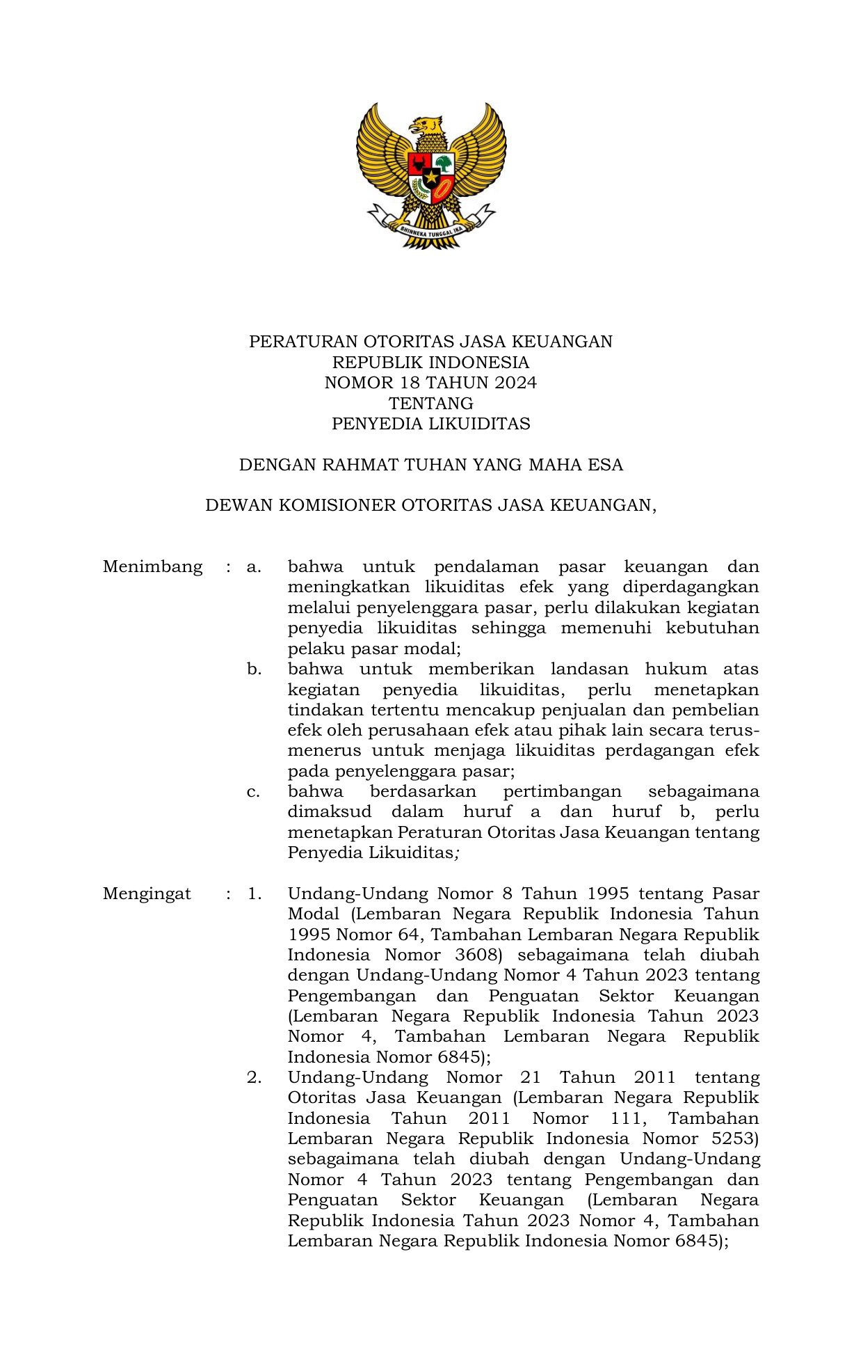 PERBAN Nomor 18 Tahun 2024 | Peraturan Badan Nomor 18 Tahun 2024 tentang Penyedia Likuiditas