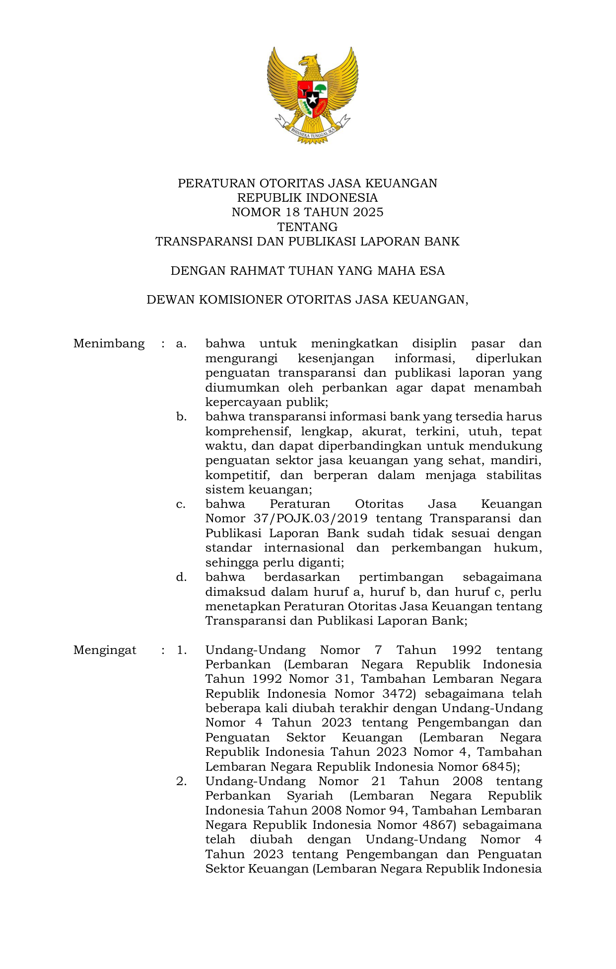 PERBAN Nomor 18 Tahun 2025 | Peraturan Badan Nomor 18 Tahun 2025 tentang Transparansi dan Publikasi Laporan Bank