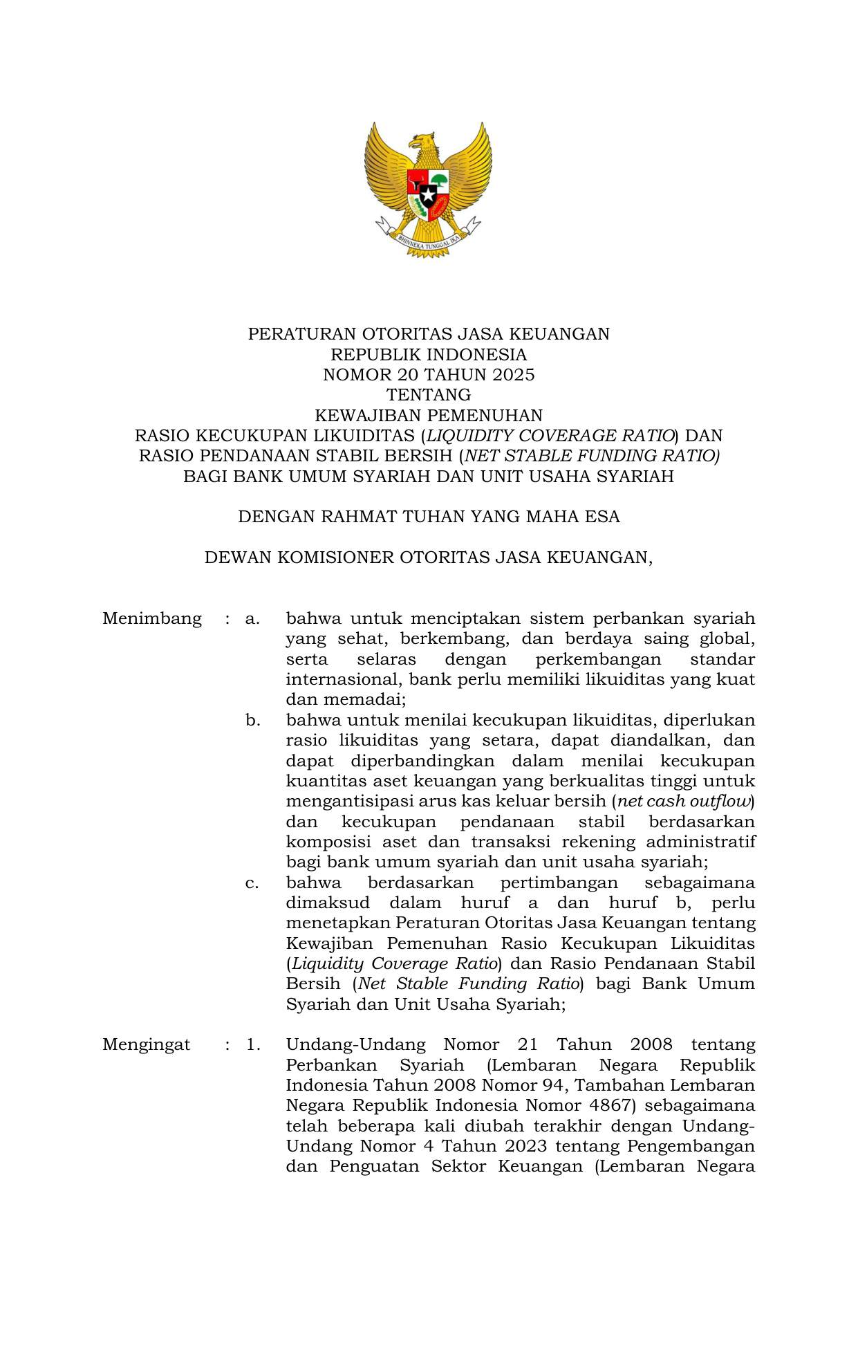 PERBAN Nomor 20 Tahun 2025 | Peraturan Badan Nomor 20 Tahun 2025 tentang Kewajiban Pemenuhan Rasio Kecukupan Likuiditas Liquidity Coverage Ratio dan Rasio Pendanaan Stabil Bersih Net Stable Funding Ratio Bagi Bank Umum Syariah Dan Unit Usaha Syariah