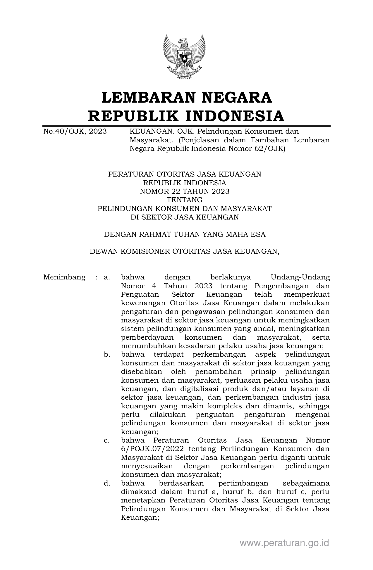 PERBAN Nomor 22 Tahun 2023 | Peraturan Badan Nomor 22 Tahun 2023 tentang PELINDUNGAN KONSUMEN DAN MASYARAKAT DI SEKTOR JASA KEUANGAN