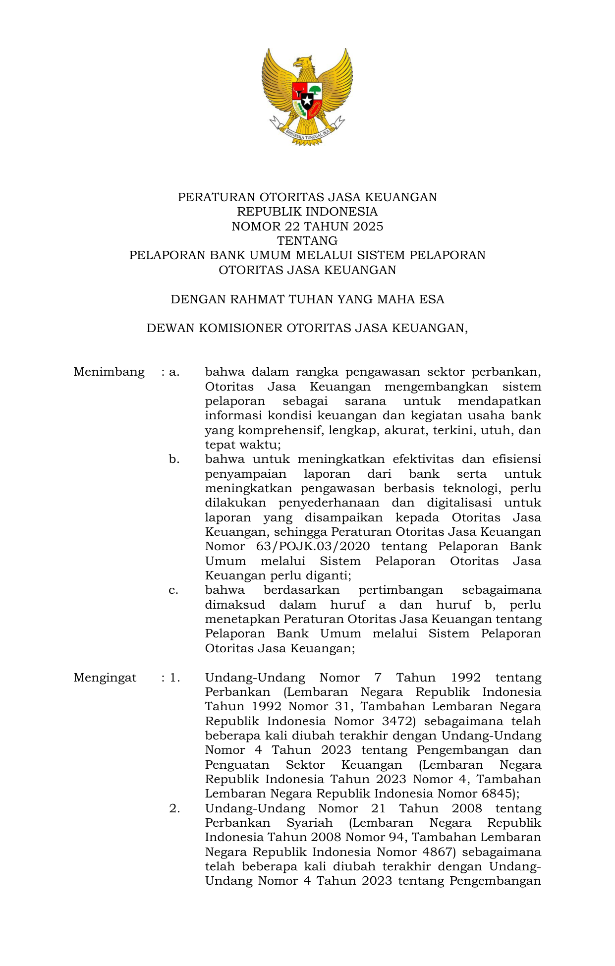 PERBAN Nomor 22 Tahun 2025 | Peraturan Badan Nomor 22 Tahun 2025 tentang Pelaporan Bank Umum Melalui Sistem Pelaporan Otoritas Jasa Keuangan