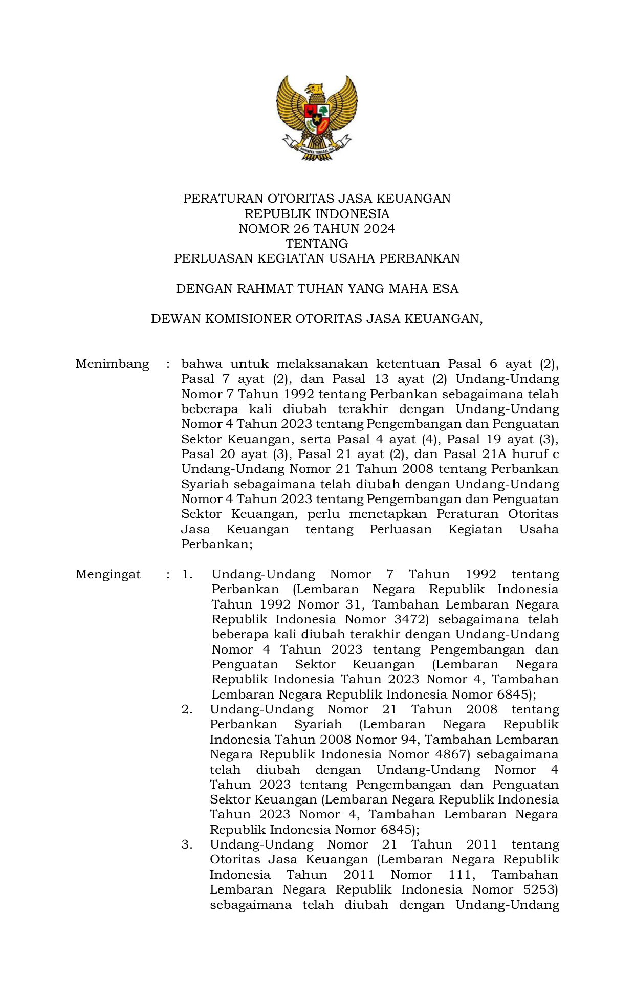 PERBAN Nomor 26 Tahun 2024 | Peraturan Badan Nomor 26 Tahun 2024 tentang PERLUASAN KEGIATAN USAHA PERBANKAN