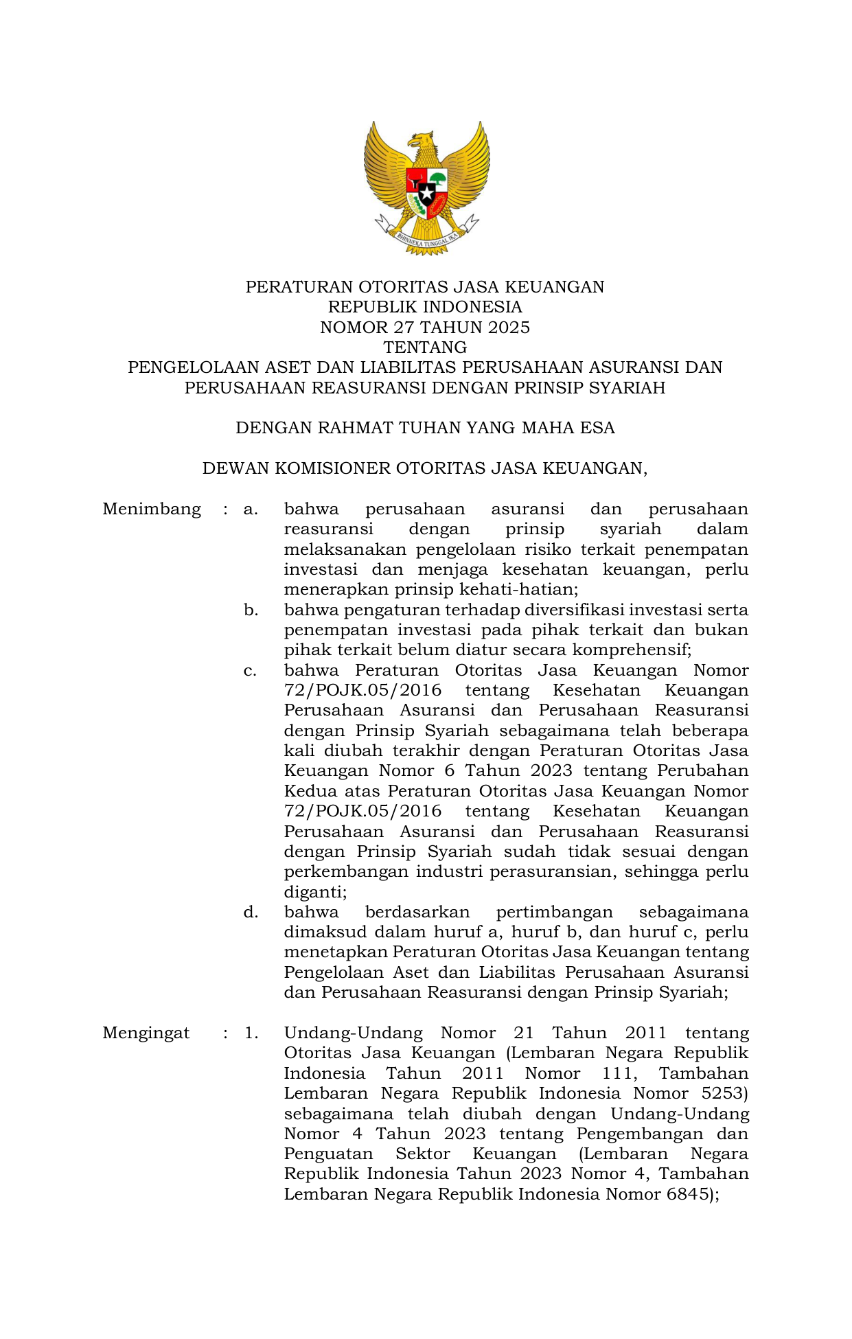 PERBAN Nomor 27 Tahun 2025 | Peraturan Badan Nomor 27 Tahun 2025 tentang Pengelolaan Aset dan Liabilitas Perusahaan Asuransi dan Perusahaan Reasuransi dengan Prinsip Syariah