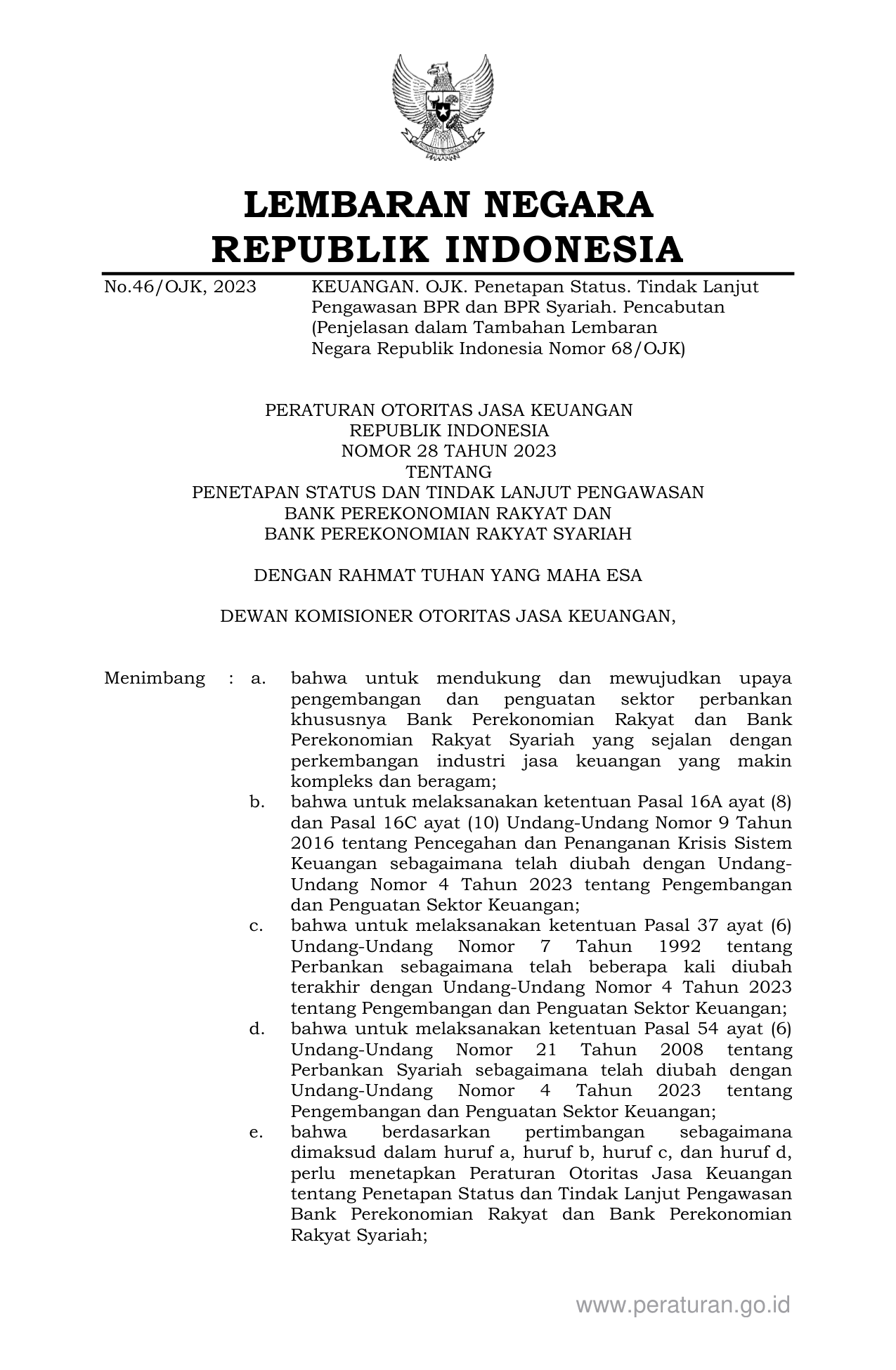 PERBAN Nomor 28 Tahun 2023 | Peraturan Badan Nomor 28 Tahun 2023 tentang PENETAPAN STATUS DAN TINDAK LANJUT PENGAWASAN BANK PEREKONOMIAN RAKYAT DAN BANK PEREKONOMIAN RAKYAT SYARIAH