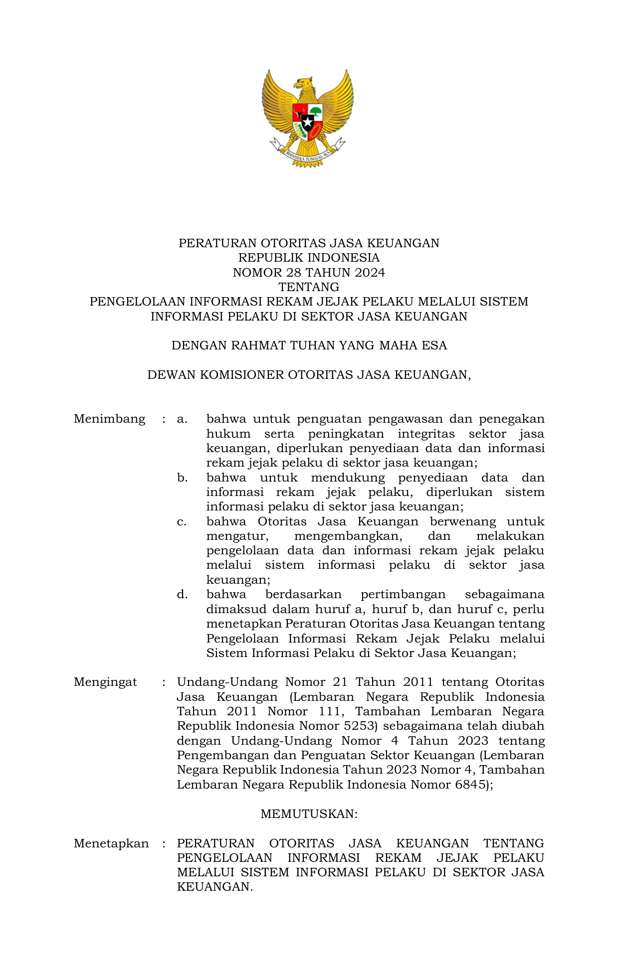 PERBAN Nomor 28 Tahun 2024 | Peraturan Badan Nomor 28 Tahun 2024 tentang Pengelolaan Informasi Rekam Jejak Pelaku Melalui Sistem Informasi Pelaku di Sektor Jasa Keuangan