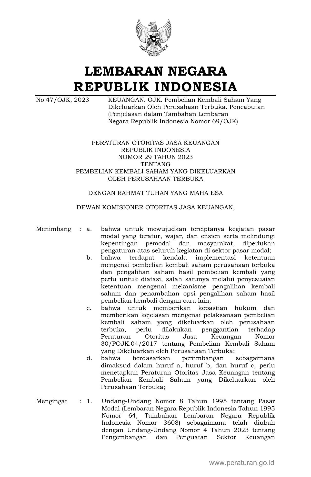 PERBAN Nomor 29 Tahun 2023 | Peraturan Badan Nomor 29 Tahun 2023 tentang PEMBELIAN KEMBALI SAHAM YANG DIKELUARKAN OLEH PERUSAHAAN TERBUKA