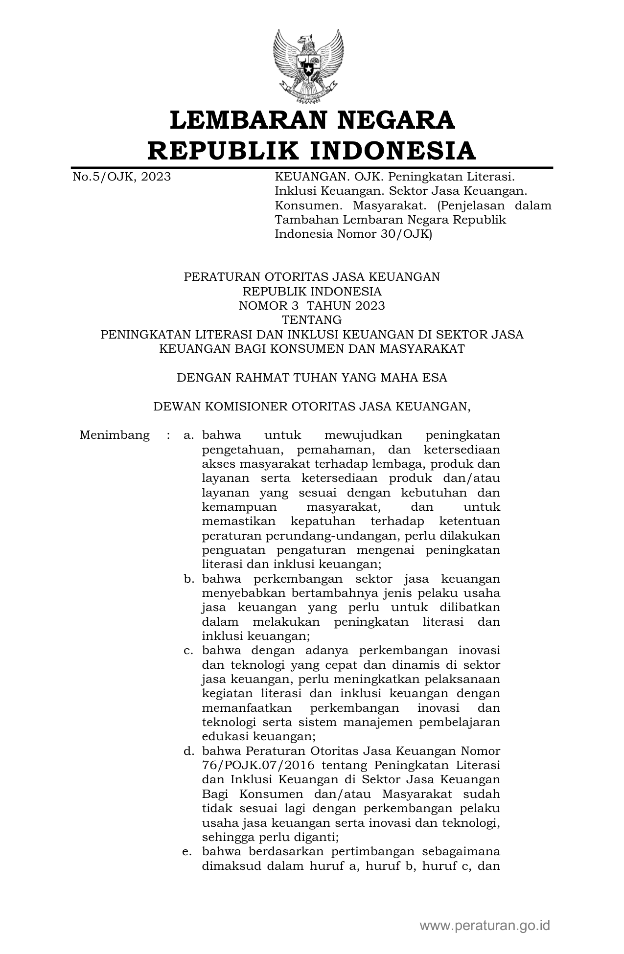 PERBAN Nomor 3 Tahun 2023 | Peraturan Badan Nomor 3 Tahun 2023 tentang PENINGKATAN LITERASI DAN INKLUSI KEUANGAN DI SEKTOR JASA KEUANGAN BAGI KONSUMEN DAN MASYARAKAT