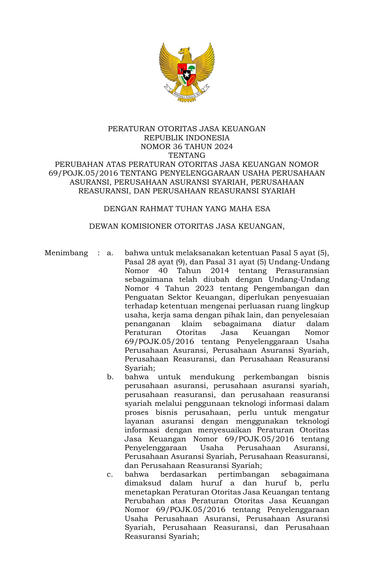 PERBAN Nomor 36 Tahun 2024 | Peraturan Badan Nomor 36 Tahun 2024 tentang Perubahan Atas Peraturan Otoritas Jasa Keuangan Nomor 69/POJK.05/2016 tentang Penyelenggaraan Usaha Perusahaan Asuransi, Perusahaan Asuransi Syariah, Perusahaan Reasuransi, dan Perusahaan Reasuransi Syariah