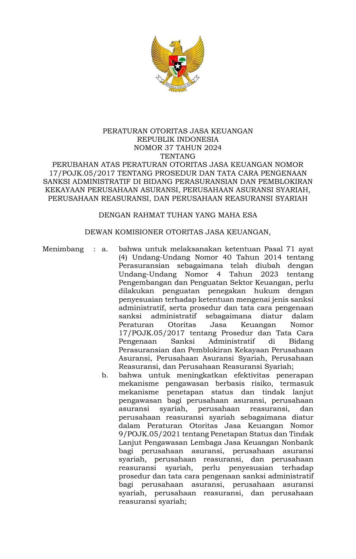 PERBAN Nomor 37 Tahun 2024 | Peraturan Badan Nomor 37 Tahun 2024 tentang Perubahan Atas Peraturan Otoritas Jasa Keuangan Nomor 17/POJK.05/2017 tentang Prosedur dan Tata Cara Pengenaan Sanksi Administratif di Bidang Perasuransian dan Pemblokiran Kekayaan Perusahaan Asuransi, Perusahaan Asuransi Syariah, Perusahaan Reasuransi, dan Perusahaan Reasuransi Syariah