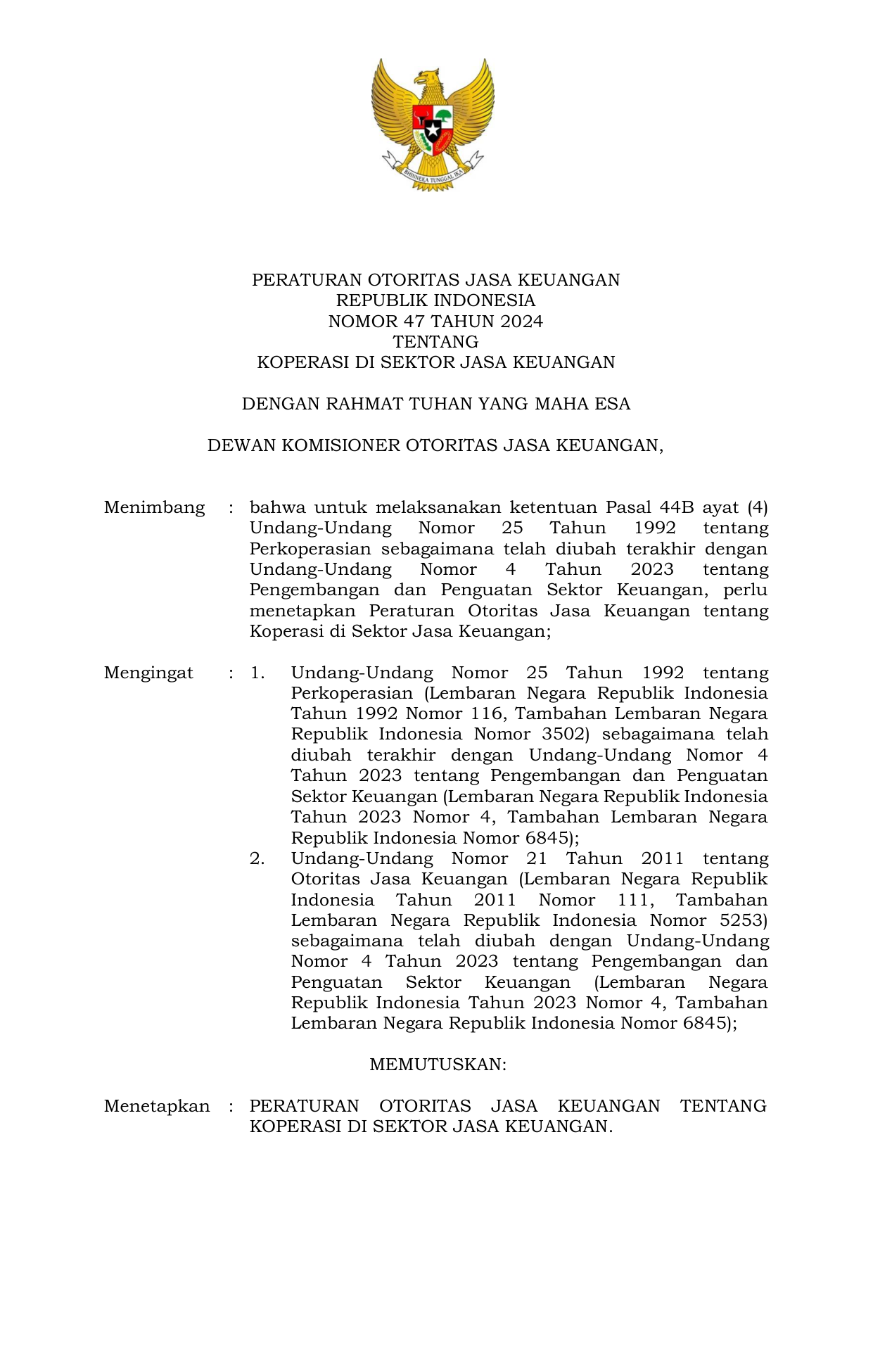 PERBAN Nomor 47 Tahun 2024 | Peraturan Badan Nomor 47 Tahun 2024 tentang Koperasi di Sektor Jasa Keuangan