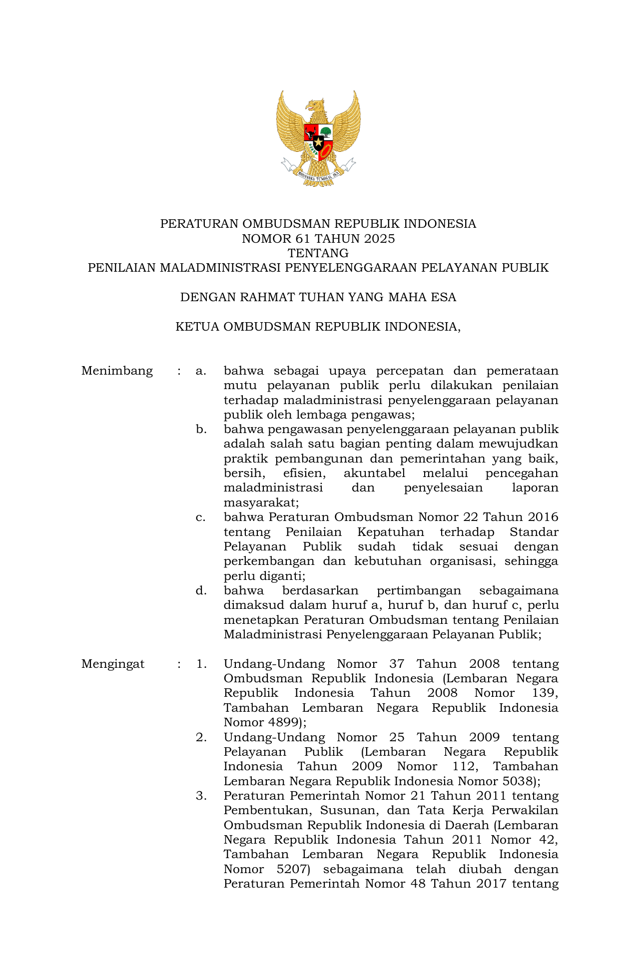 PERBAN Nomor 61 Tahun 2025 | Peraturan Badan Nomor 61 Tahun 2025 tentang Penilaian Maladministrasi Penyelenggaraan Pelayanan Publik