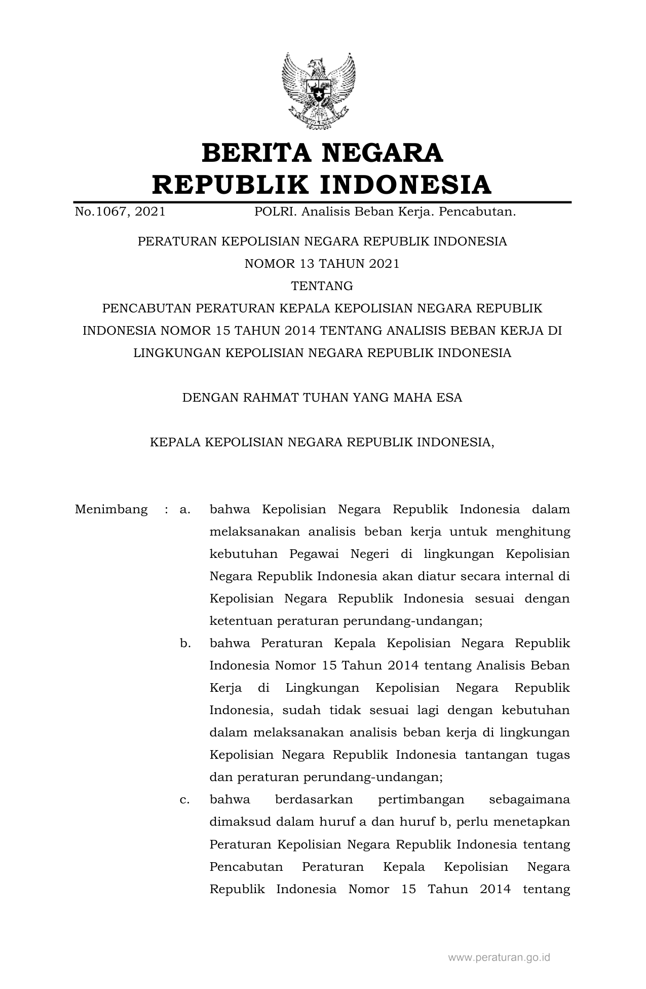 PERBAN Nomor 13 Tahun 2021 | Peraturan Badan Nomor 13 Tahun 2021 tentang PENCABUTAN PERATURAN KEPALA KEPOLISIAN NEGARA REPUBLIK INDONESIA NOMOR 15 TAHUN 2014 TENTANG ANALISIS BEBAN KERJA DI LINGKUNGAN KEPOLISIAN NEGARA REPUBLIK INDONESIA